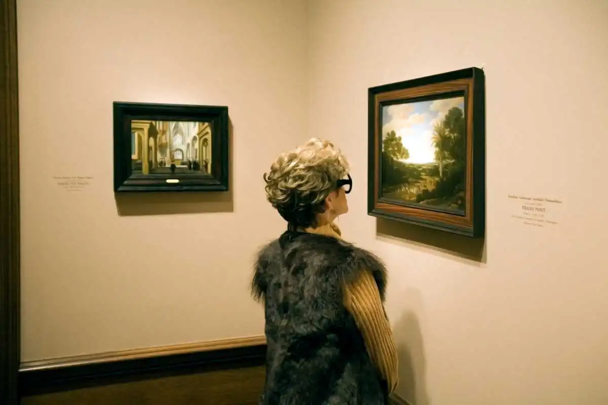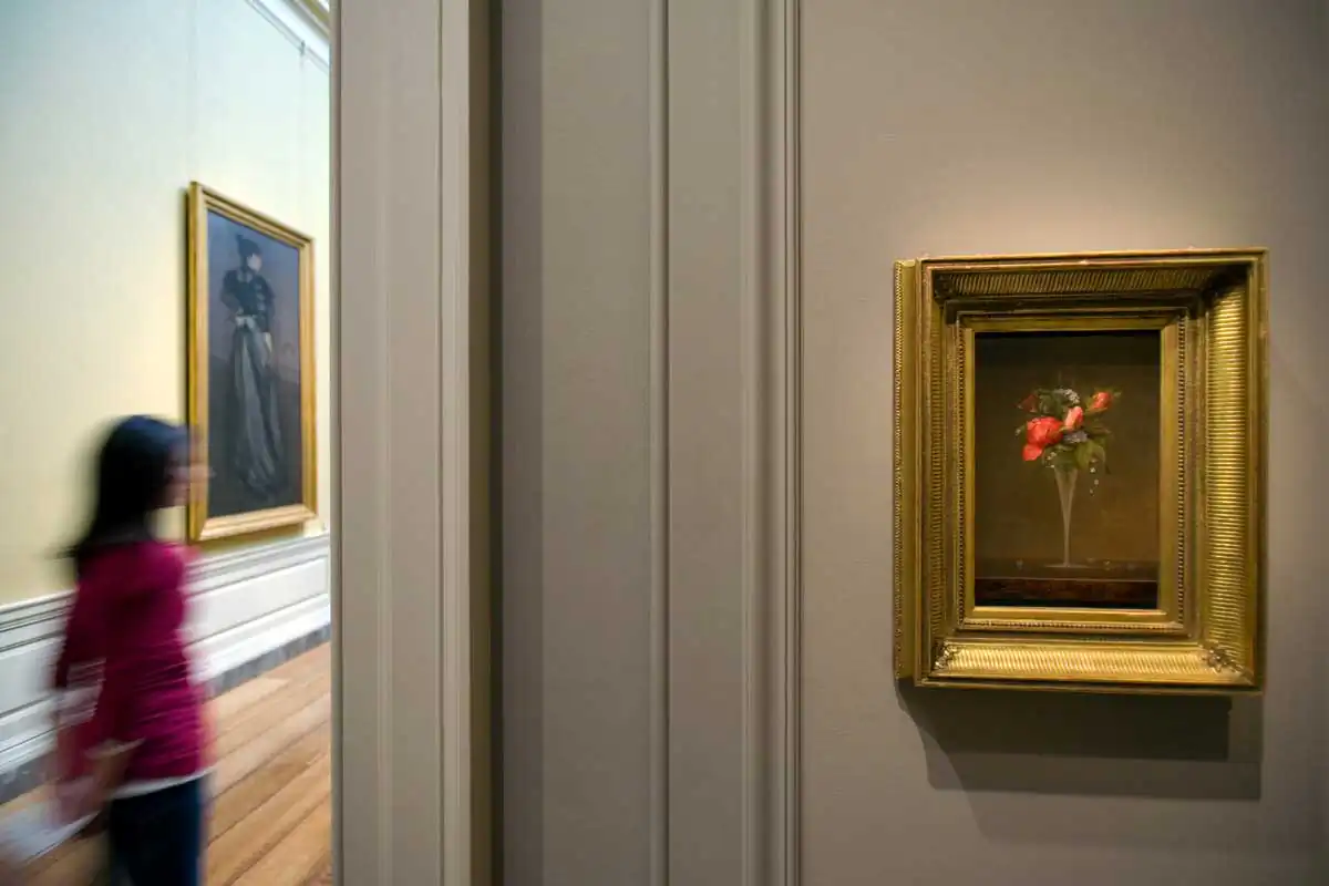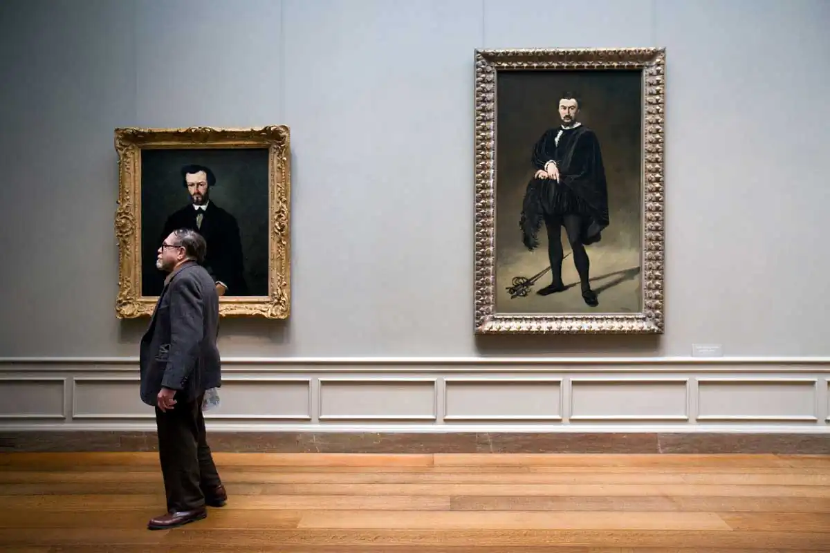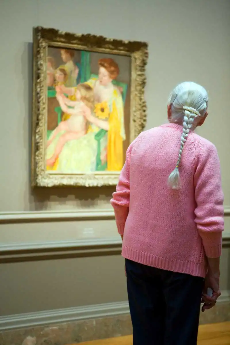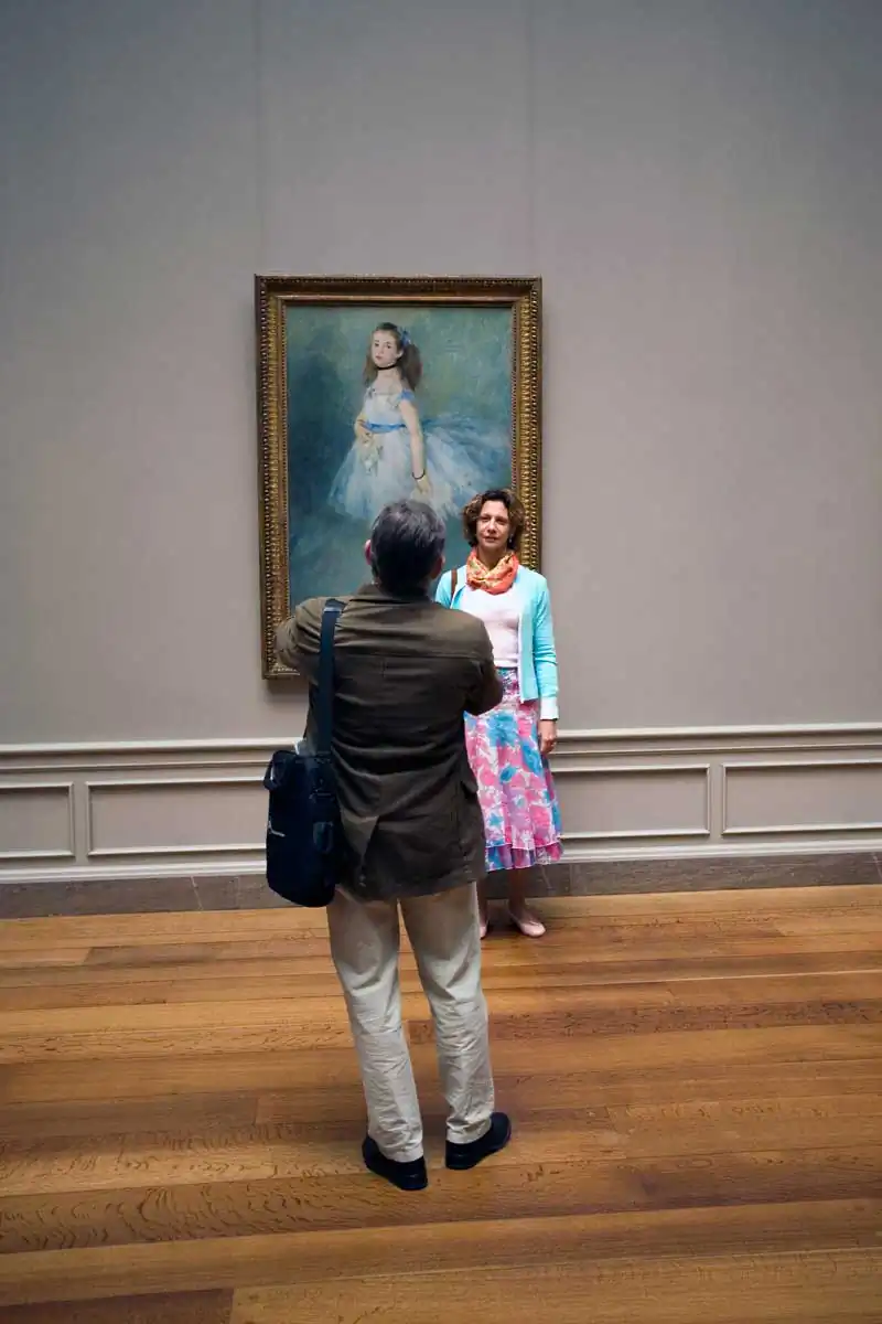 Hirshfeld captures a diversity of viewers and their interplay of looking as they move through the vast selection of artwork. Visitors peruse, stop at one painting, pass by another, linger, and even photograph the works of art. Hirshfeld is not the only one in the museum with a camera, yet his intent is not to focus on the artwork. This fact enables Hirshfeld the freedom to photograph and to go unnoticed in his looking. Cleverly Hirshfeld suggests that he may not be the only one looking at visitors looking. The portrait by Cezanne peers down upon the museum visitor who looks off to the left, focused on something out of the frame. The subjects in the art on the museum walls look at the museum-goers, even if the visitor decides not to look.