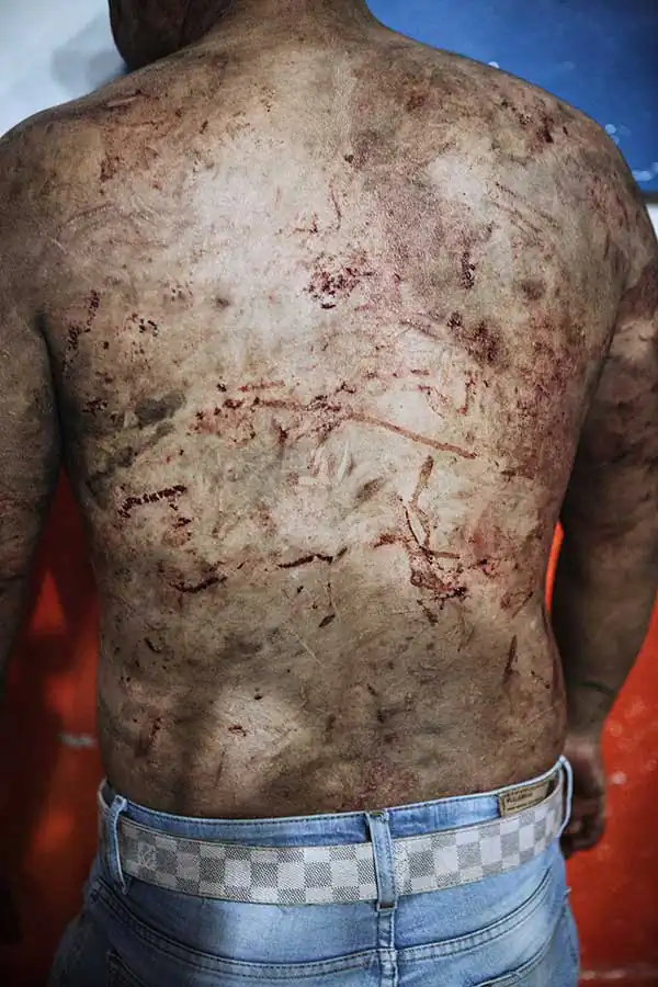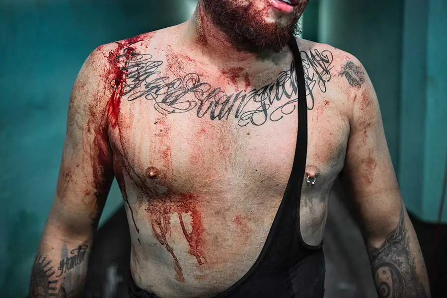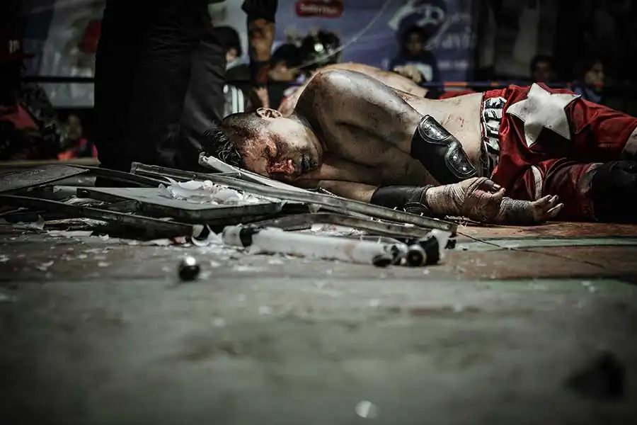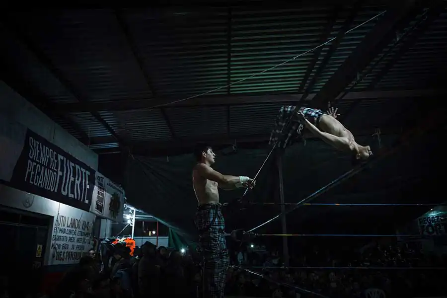 She began photographing Cassandro, a luchador “exótico” from El Paso, Texas, and became fascinated by the daily struggles he endured beneath the glamor and glitter of his stage persona. Through Cassandro, who became a close friend, Annick was introduced to many other figures within the world of Lucha Libre and began to cover the secretive, underground genre of Lucha Extrema. This semi-clandestine hardcore genre is prohibited in Mexico City because of how dangerous it is, but events still take place legally outside the capital, notably at a car wash-turned-arena in Tulancingo, the village where El Santo, Mexico’s most famous pro wrestler, was born. The participants receive professional training and are paid a little bit more because of the risks they take. They perform with a variety of weapons: chairs, thumbtacks, wire, and fluorescent lights, turning the ring into a war zone. Yet the community of luchadores “extremos” is closely knit and few outsiders have gained access.