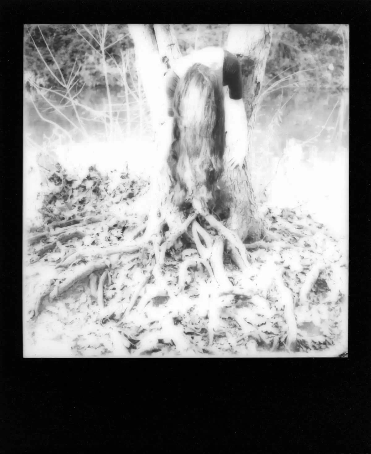 Looking for your origins you are excavating the humus and disturbing the dead leafs, vestiges of the flowered epics. Your fingers take root to the ground. Is it the pulse of your heart or the one of the earth pumping in yours veins? Taken by the vertigos of the souvenirs you are embracing this trunk so strongly that you are now part of it, so strongly that you are becoming this vertebrate stick insect: mimetism ! Did you look to the “Medusa” glance of a white lady in the forest? Your hair are wrapping like ivy, chocking or loving octopus! The skin: bark. The veins: xylem. The blood: the sap. Become wood! You are flowing along the wood vessels like we run along hand lines. To know one second the softness of the mature fruits and the pain of the blade. Right now, protected in this dormant seed, a patient mutation is occurring. From the breath of the leafs I heard the word “reborn”.
