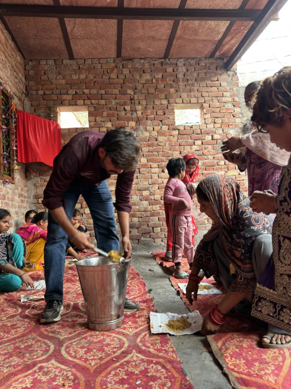 The feast that follows is as generous as the hearts behind it. Steel thalis overflow with fragrant biryani, chole, sweet gud rice, and fresh rotis, all cooked over the same open flames that sustain daily life. Women’s nathanis sway as they serve; men’s pagdis tilt with laughter. For a few hours, the settlement feels less like a place of waiting and more like a village reborn.