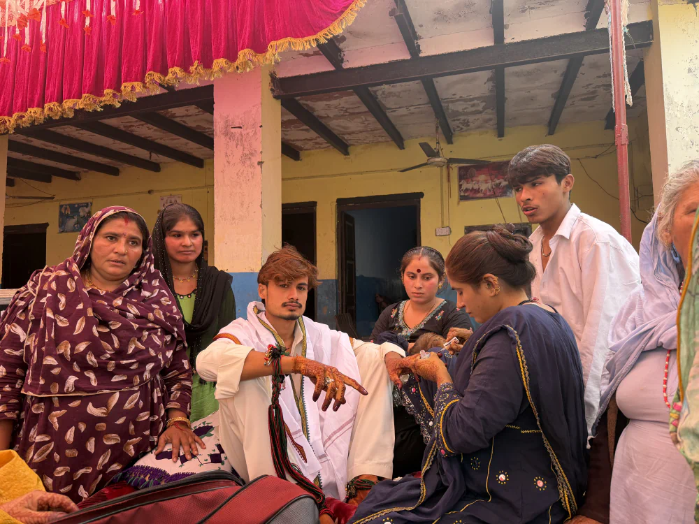 Across the settlement, Raghuveer prepares within his own circle of family. He sits surrounded by aunts and cousins, his arms already adorned with intricate henna patterns that climb like vines of good fortune. One young woman leans in to add the final details while his mother watches with quiet pride. The air fills with the soft clink of bangles and the rustle of heavy jewellery, nathanis looping delicately from nose to ear, catching what little light filters through the shamiana.