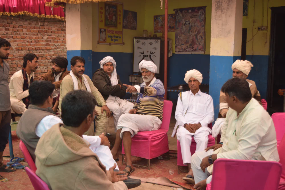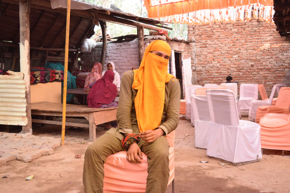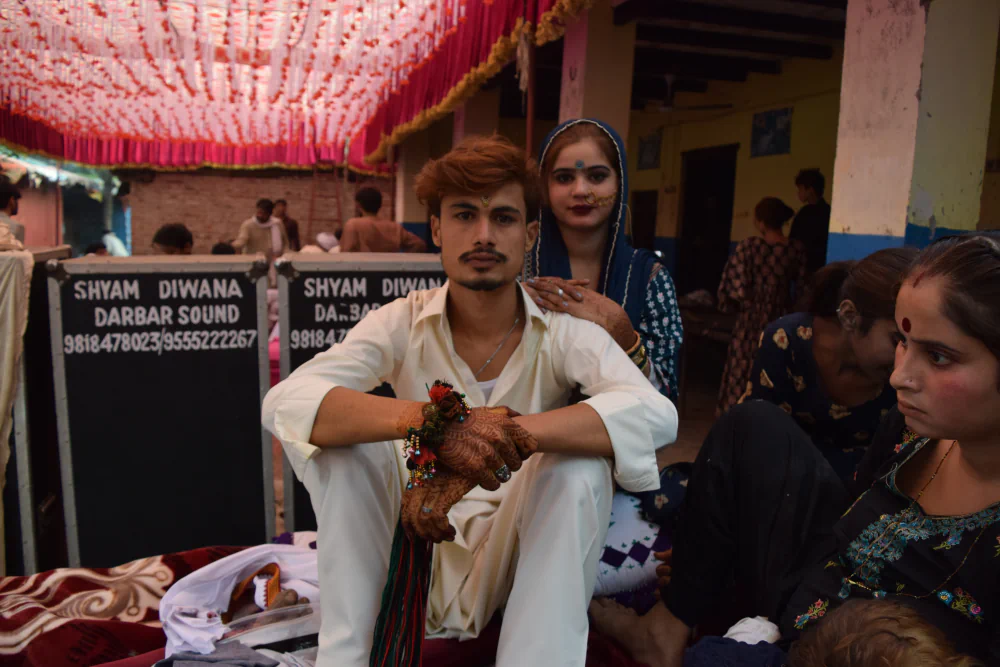 On this day, that joy multiplies. Two separate weddings unfold side by side in the settlement. Dharamraj and Raghuveer, both twenty-one, each stand at the threshold of new lives with their own brides. The pink shamiana stretched across the groom’s courtyard glows like a banner of hope, sheltering families who have carried traditions across borders to take part in these unions. Under its canopy, men gather on bright plastic chairs, some in crisp white dhotis and neatly wrapped pagdis, others in Pathani suits that still echo their Sindhi roots. They lean in close, voices rising in easy laughter and pointed advice, as one elder gestures firmly while guiding the day’s arrangements.