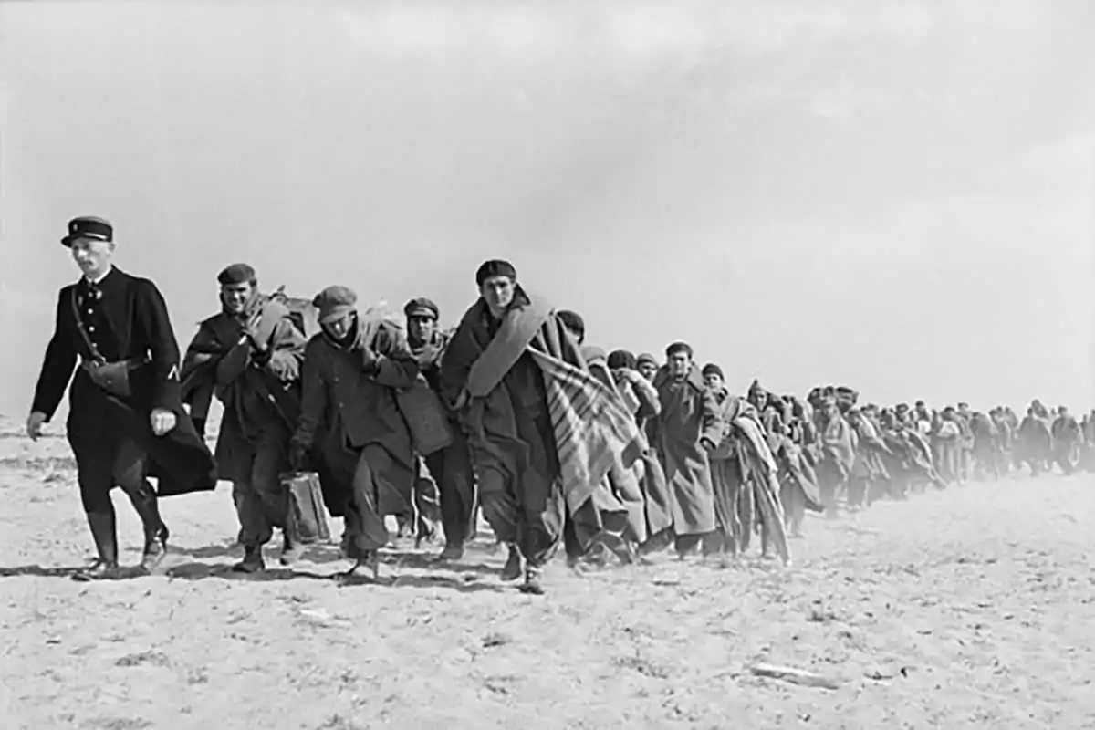 Exiled Republicans being transferred from one part of an internment camp for Spanish refugees to another.