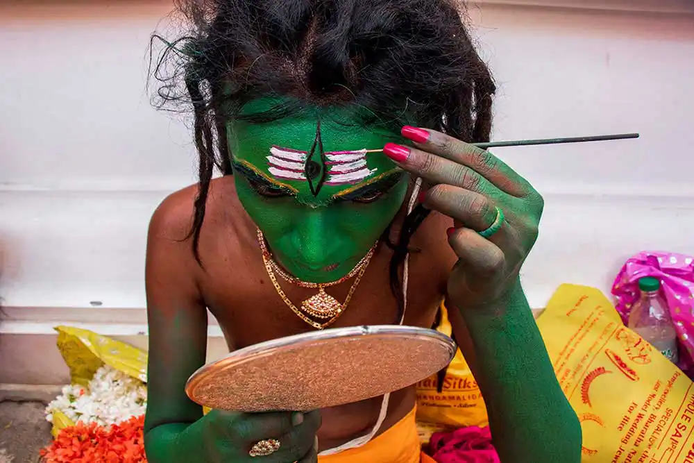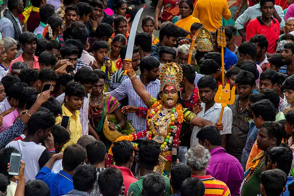 Kaveripattinam is a panchayat town in Krishnagiri districts in the Indian state of Tamil Nadu. On this day tens of devotes can be seen at the temple. The festivals stand out because of “Kaliakam”. The personification of goddess Kali. This transformation of kids, men and women are done by painting their faces and adorning attire like Goddess Kali. Once they are ready, they hide their faces until they reach the temple and worship the goddess. There are others who express their devotion by having various parts of them pierced by a metal spear, knife or hooks that are used to dangle them. They parade around the village till evening.