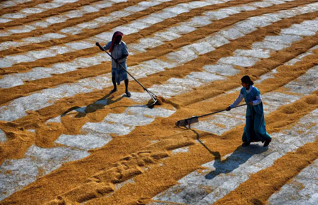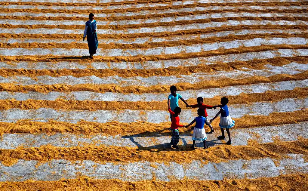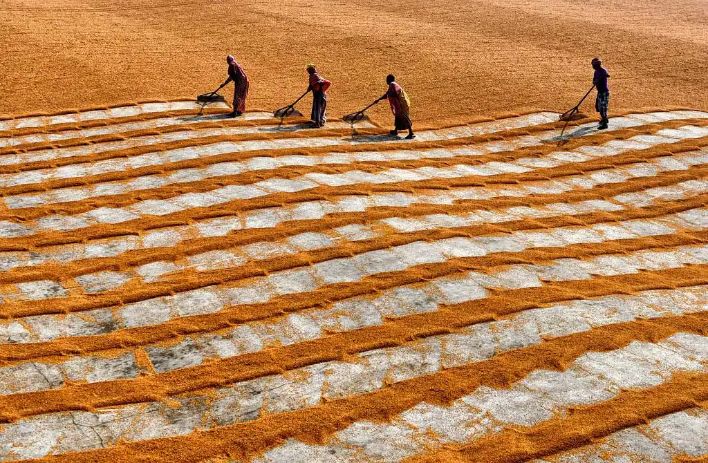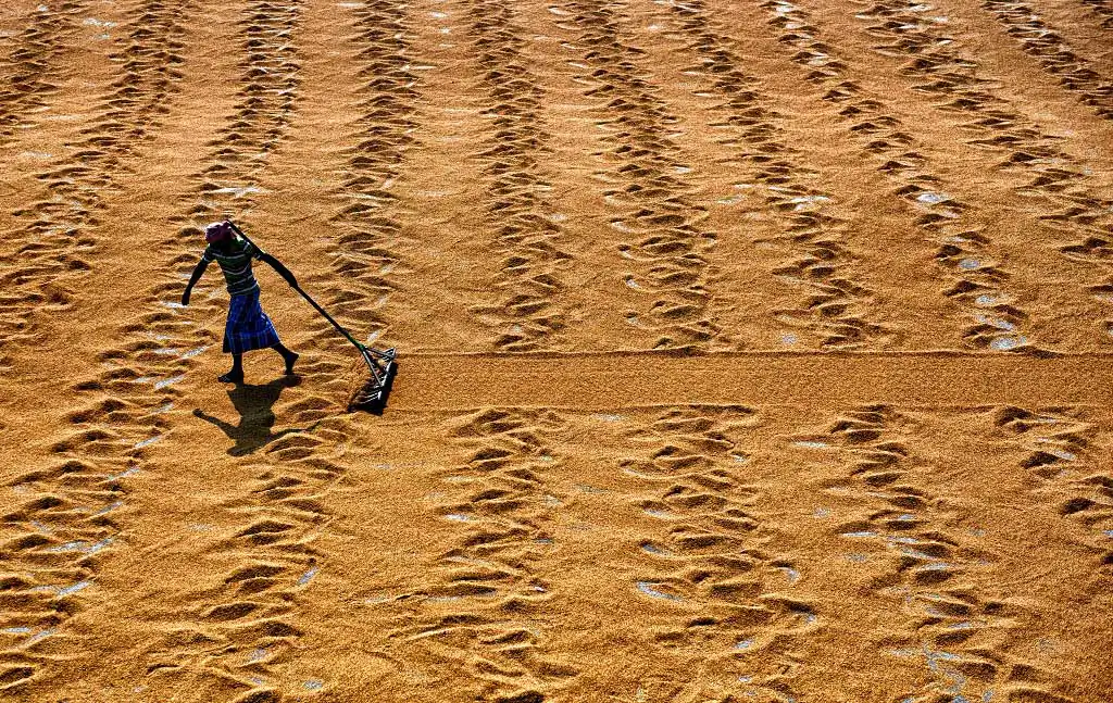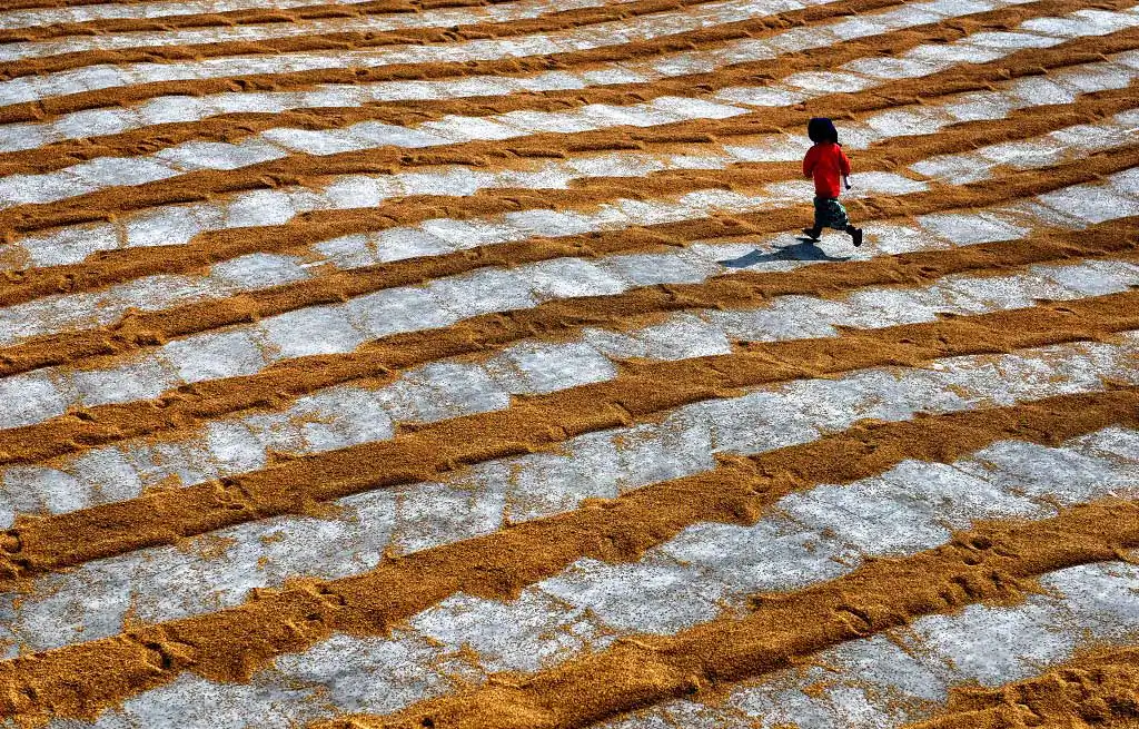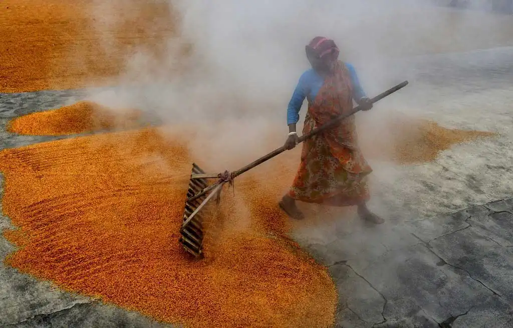 The 1st day labours are used to make a brush on the steamed grains to make it scattered and leave for a day under open sky, it believes that under Fog the grains dried well, and it helps to get proper color of rice seed, the more Fog it gets it became whiter at Machine. Next day Labours are starting the job again with their Comb type instrument to scatter the same & also use their legs so that it can be rolled properly and getting proper sunlight for a day which actually help to dry out the entire moisture from the grains. Thus, every drying process actually took 2 days of time & then send to rice mill for final processing to make fine quality rice.