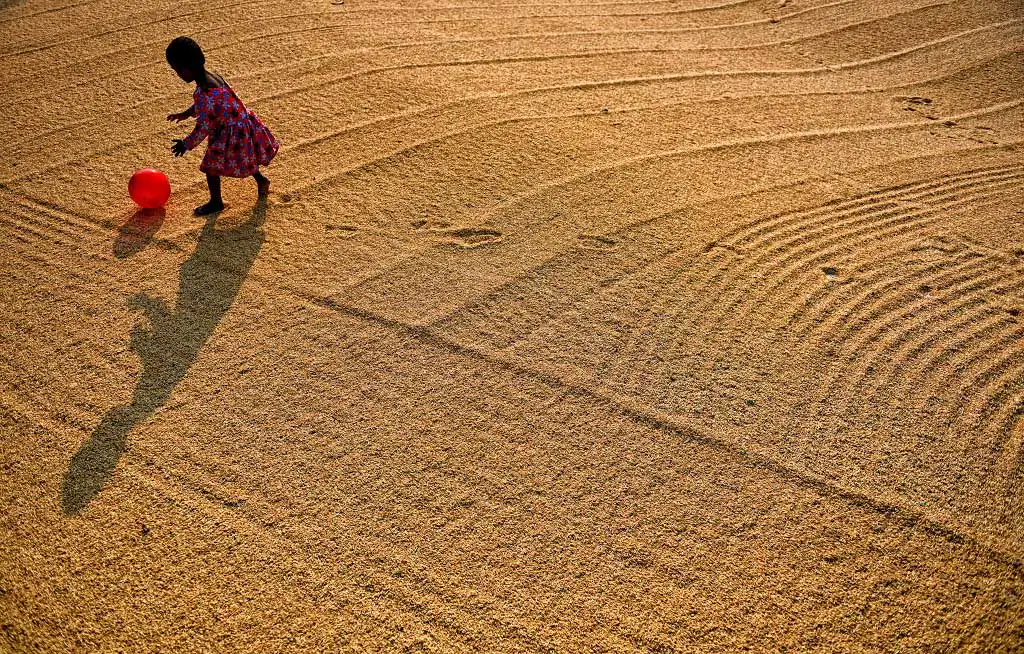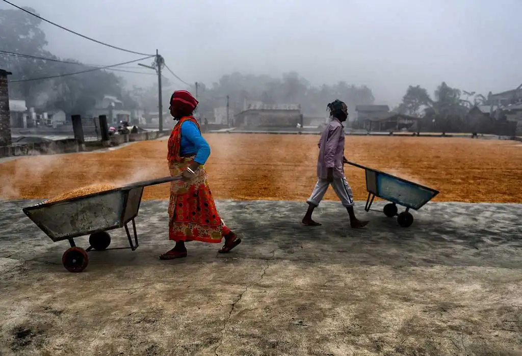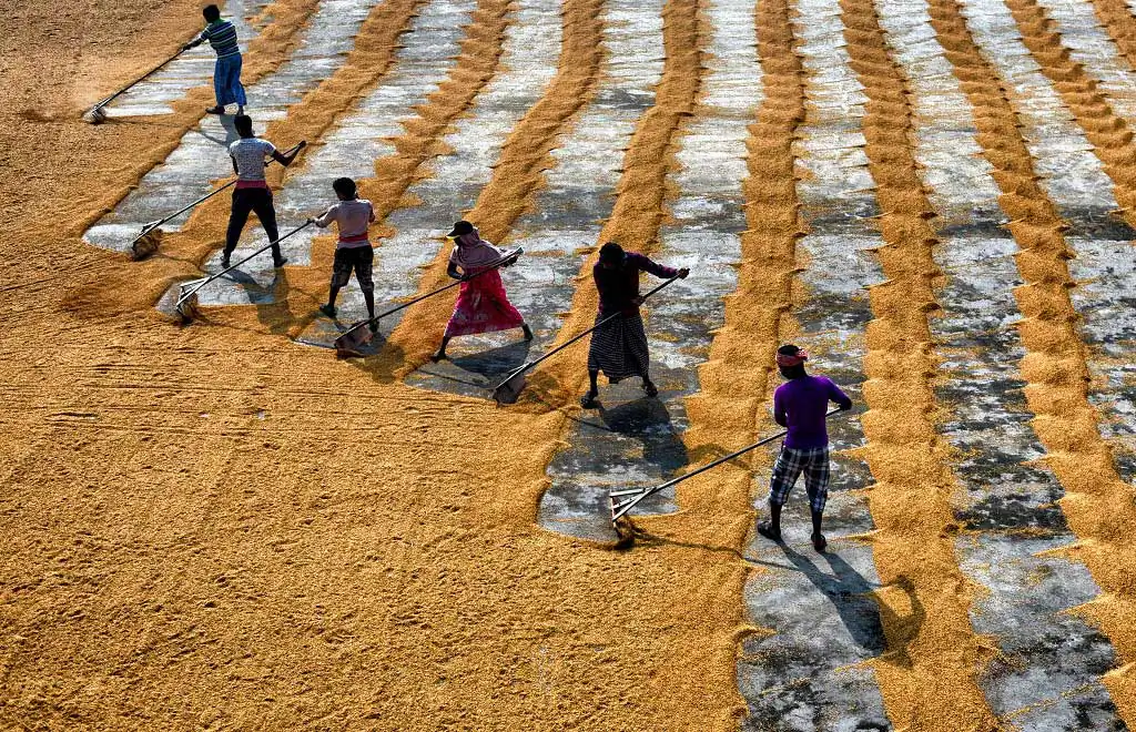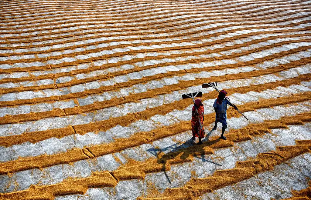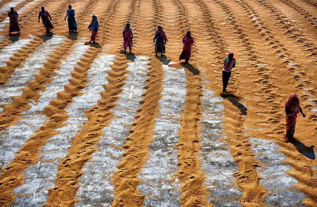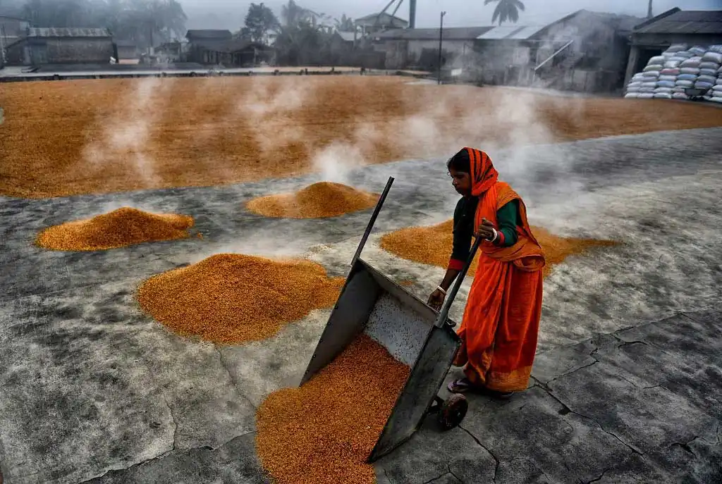 The 1st day labours are used to make a brush on the steamed grains to make it scattered and leave for a day under open sky, it believes that under Fog the grains dried well, and it helps to get proper color of rice seed, the more Fog it gets it became whiter at Machine. Next day Labours are starting the job again with their Comb type instrument to scatter the same & also use their legs so that it can be rolled properly and getting proper sunlight for a day which actually help to dry out the entire moisture from the grains. Thus, every drying process actually took 2 days of time & then send to rice mill for final processing to make fine quality rice.