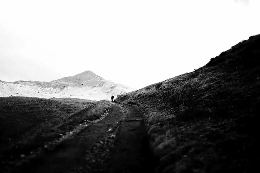 Thus, the first task of such a journey was to look for portraits of subjects and mountains together; sometimes juxtaposed to each other, sometimes one lost into the other. No scale, or comparative constructions, can render the relationship between a human being and mountains, but an humble depiction of someone in nature successfully shows how our bodies are microscopic forms coming from the same matrix giving life to peaks and forests. When walking, climbing, or being reflected into a mountain lake, we, like animals, fit into this magical space without the rush to arrive, to mark our presence at the end of a line.