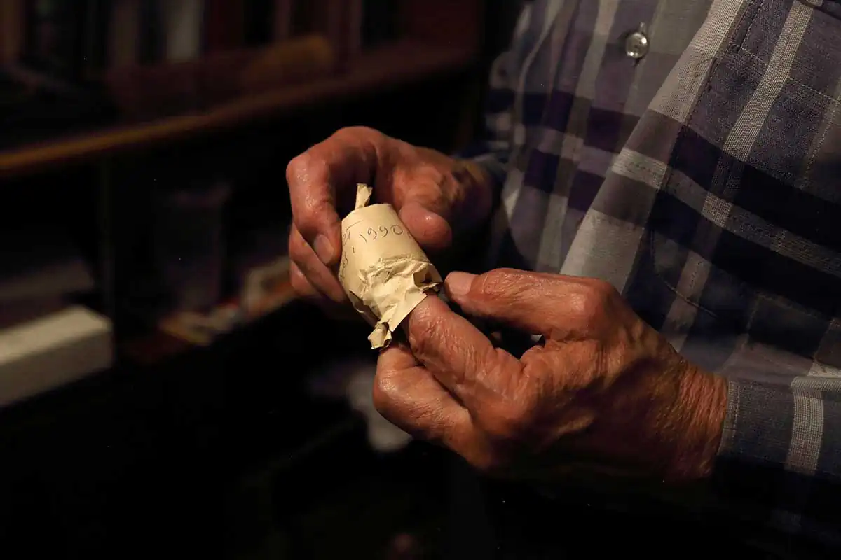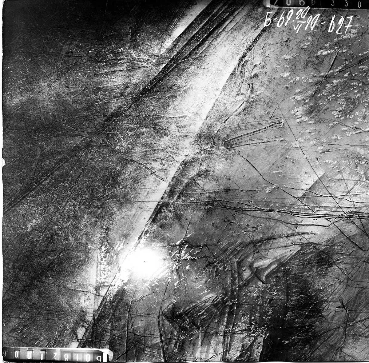 Slides of the 1910-2010’s, showing the level of seasonal and perennial fluctuations of the Aral Sea. In 1963, Boris Smerdov graduated from Tomsk State University, specializing in Land Hydrology. He was doing postgraduate studies in Hydrology at Krasnodar Agricultural Institute. In 1980 he joined Kazakh Research Hydrometeorological Institute in Alma-Ata. The young scientist monitored the Aral Sea level in different parts of it. He compiled graphs, studying the sea regime using them, and investigating its trends. – I saw the Aral Sea level steadily falling since 1961. But there was no any serious concern about it. I thought it was one of the temporary fluctuations. The sea water level was changing regularly. Furthermore, the Aral sea level had shallowed before, moreover, it was a dry land. The Aral Sea emerged about 10,000 years ago, when the Amu Darya River, which until then had run into the Caspian Sea, turned north and began filling with water a tectonic depression – a large southern part of the future Aral Sea. Before, only the Syr Darya flowed into this depression, feeding a relatively small pond. According to some scientists, the Amu Darya turned several times toward the Caspian Sea, according to others, the river turned away from the Aral only once. And at that time, the Aral Sea began shallowing. In 2001, on the dry bottom of the Aral, the inhabitants of the village of Karateren, and then archaeologists, discovered an ancient settlement and a large mausoleum. Then people joked that the Kazakhs had found the Aral Atlantis. The artifacts confirmed that there existed a town on the bottom of the Aral Sea: its townsfolk built houses, erected mausoleums, and engaged in agriculture. The sea was a dry land at that time, but the water came back. About 150 years ago, “water lavishly flooded the land” more than ever. The Aral made the top four lakes on the planet. Our fathers and grandfathers remembered the Aral as blue and full of fish.Photo from the Boris Smerdov’s archive. Two “Rockets” under the water. The length of each is 600 m.Photo from the Boris Smerdov’s archive. «Car entry and a snake», aerial photo 1990. -This shot I called «Car entry and a snake». It is the most exciting for me. Width of wheel track of so called “car” which entered by the steep slope is 250 meters, while “wheel” width is 50 meters. From the left top corner of the picture a “snake” is going down and her head almost touches the wheel track. Using 100-200 times magnification “scales” of the “snake” are clearly seen. The “scales” look like cells and require further investigation. No earth technique is able to draw such huge and smooth furrows on the seabed. I calculated that the drawing of these Aral signs will require a continuous operation of 90,000 twenty-ton vehicles for 25 years. – I consulted and shared my findings with geologists, geophysicists, geographers, astronomers, ufologists, mathematicians, designers, including in the field of underwater military technology – with anyone who could show interest in the Aral signs. All scientists shrugged shoulders and took me for an eccentric. I had to continue the study alone, relying only on wife’s and children’s support.Boris Smerdov unpacks a film from year 1990 expedition. Aral is everywhere in one-room apartment of the scientist. Folders with drawings and formulas, letters, maps, tens of films – all what have collected for 25 years of communication with Aral. Scientist carefully store every sheet of paper, every record.Boris Smerdov is looking at film from year 1989 expedition.Helicopter MI 8. In 1989 году five employees of the Kazakh Scientific and Research Hydrometeorological Institute, flew to the Aral Sea for sand samples.A stone sample from the southern part of the Kokaral Peninsula. Boris Smerdov have been studying Aral for a quarter of century. He visited it’s shores many times. The scientist returns from the sea laden with stones – he got a full backpack. Smerdov was especially impressed by this stone with innumerable inclusions of shells.Aluminum sample boxes for soil samples. Inside – soil samples from the Aral signs. The sample boxes are numbered, sealed with adhesive tape. Information about the samples is written in the scientist’s notebook. – In 1996, our guide Margulan Zheksembiev found two furrows on the eastern dried sea coast – two Aral Traces, – says Boris Afanasyevich. – Margulan is a resident of aul Karateren, an observer of a hydrological post on the Syr Darya River, one of the best connoisseurs of his land, a guide to several foreign expeditions in the Aral Sea region, a longtime friend of mine and a participant in the work in the lower reaches of the Syr Darya. He was in the know about the Aral signs and was very interested in their search and study. I made a cross-section of a furrow and brought samples of soil and algae to Almaty. For 20 years the land from the Aral Sea was stored in a refrigerator, tightly packed in sample bottles. I never opened them. So I do not know in what condition they are, especially the algae. I do not open them, I’m afraid to break something important. I did not send them to the laboratory, because I did not have enough money.Boris Smerdov is looking into binocular which shows azimuth. The scientist from Almaty was offered to write a book about the Aral signs. The French Data Bank of Abnormal Phenomena got interested in the strange lines on the Aral bottom. The French offered to send their employee to conduct joint research, and Boris Smerdov was required to cover the cost of his stay in Kazakhstan and travel to the Aral Sea. An ordinary scientist could not afford it because of high costs. – Traces of the Aral Sea do not let me go. The Aral furrows were drawn under a 15-m water column at a time when the sea was deep. Who covered the seabed with lines and why? I have more questions than answers.The scheme of Boris Smerdov’s life. The