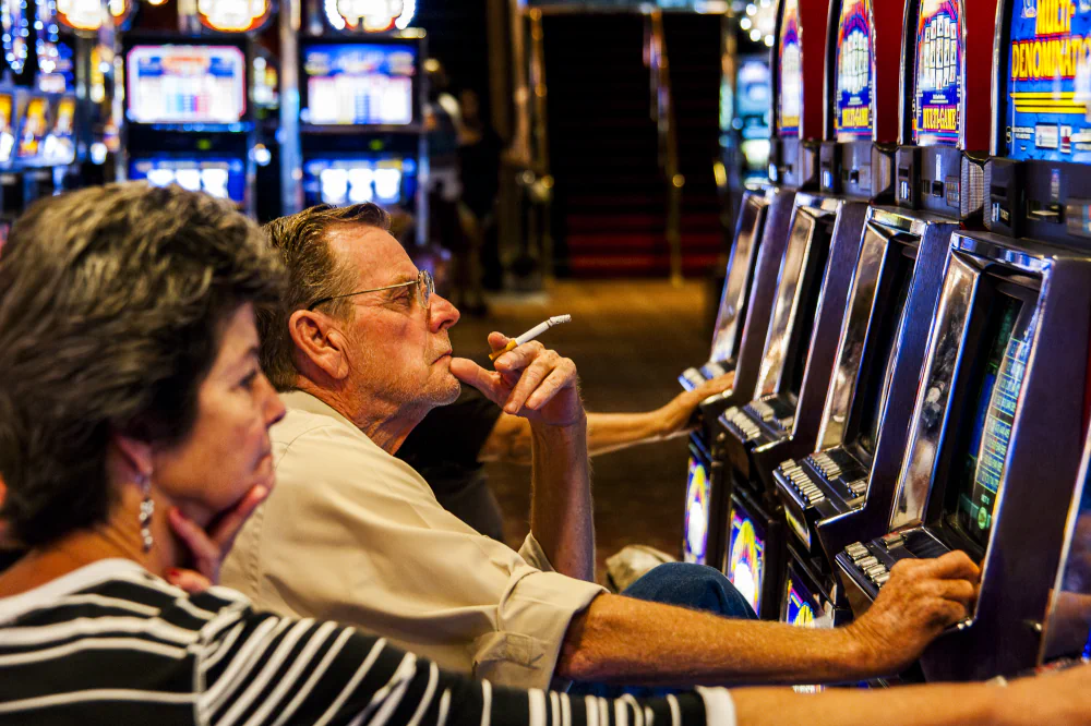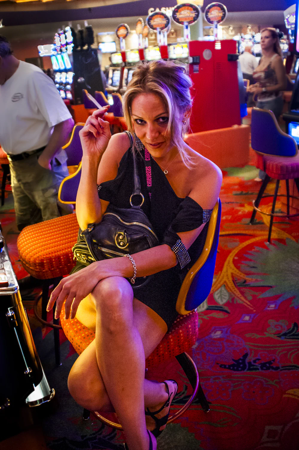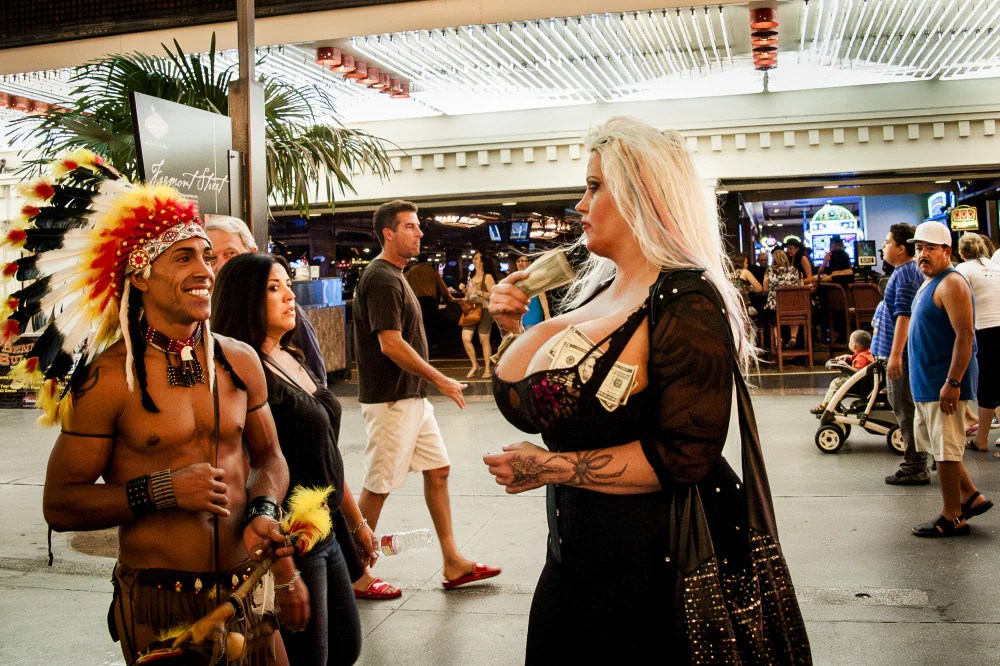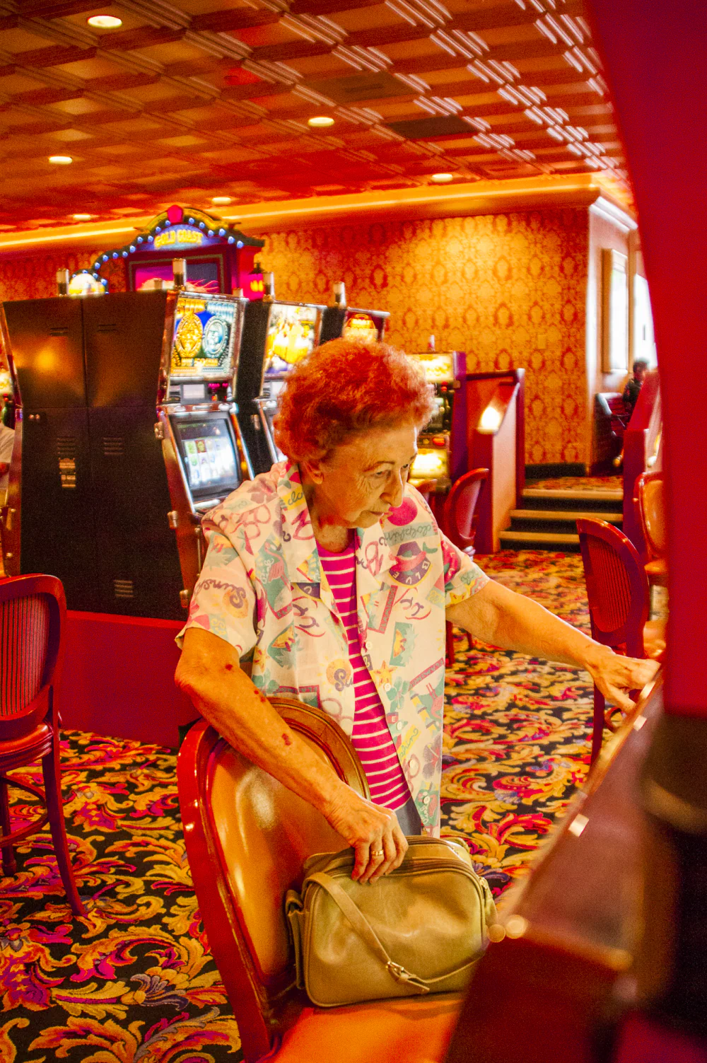 Rows of shrill slot machines, glowing billboards, and gaudy splendor appear alongside exhausted faces, weary expressions, and lost games.