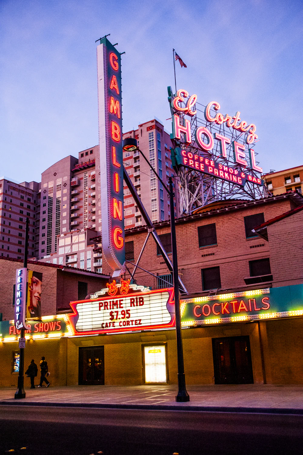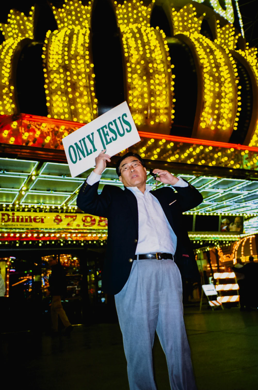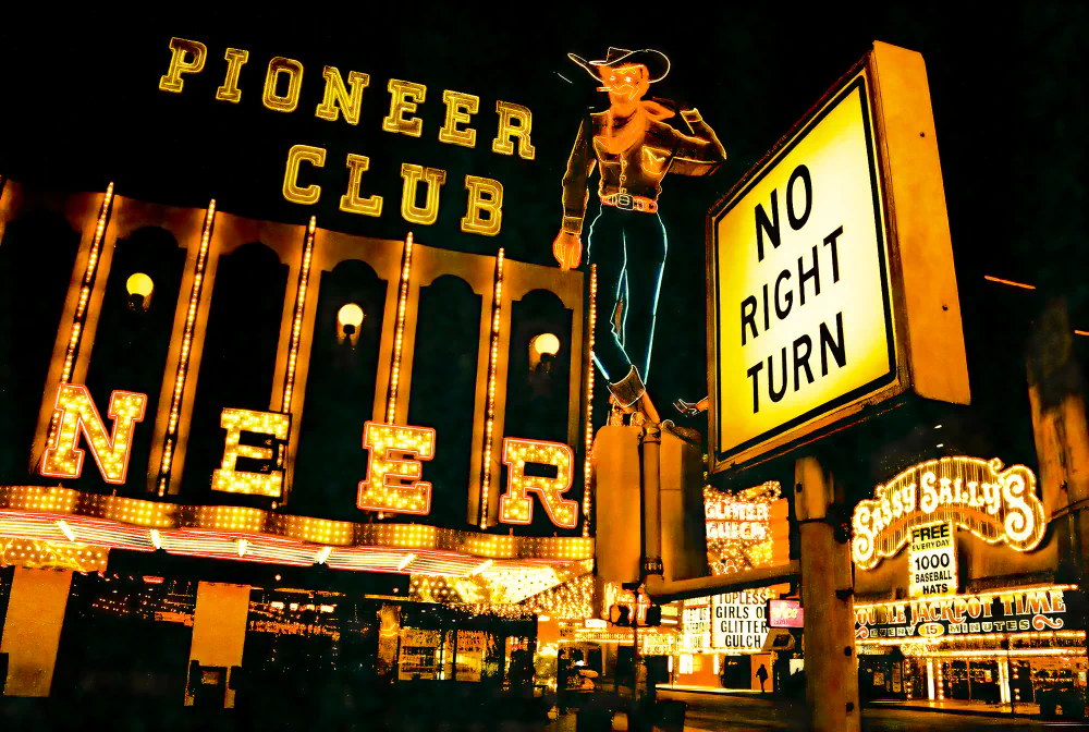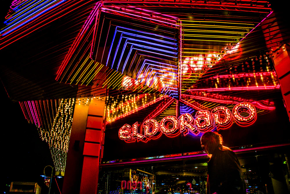 Rows of shrill slot machines, glowing billboards, and gaudy splendor appear alongside exhausted faces, weary expressions, and lost games.