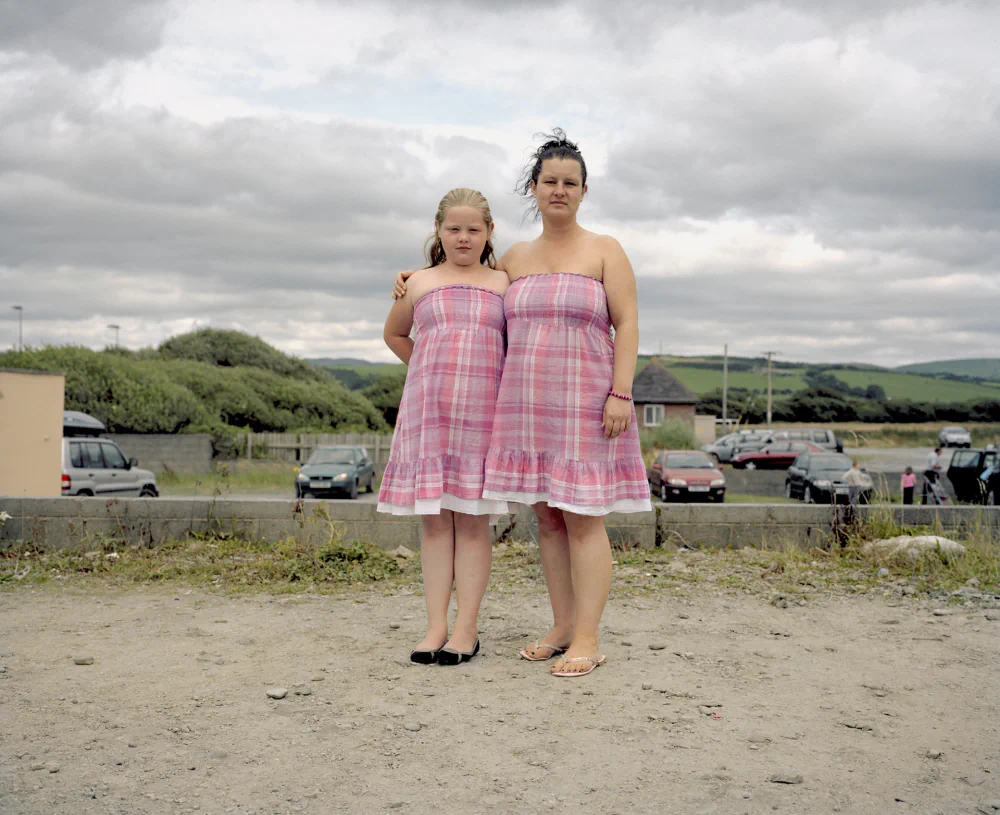 For other characters, summer is a state of mind more than a matter of meteorology. They believe in summer even when it is cold and grim: a boy in his board shorts works up the will to swim in a slate-grey sea; a mother and daughter in matching pink summer dresses and flip-flops pose in a dusty car park.