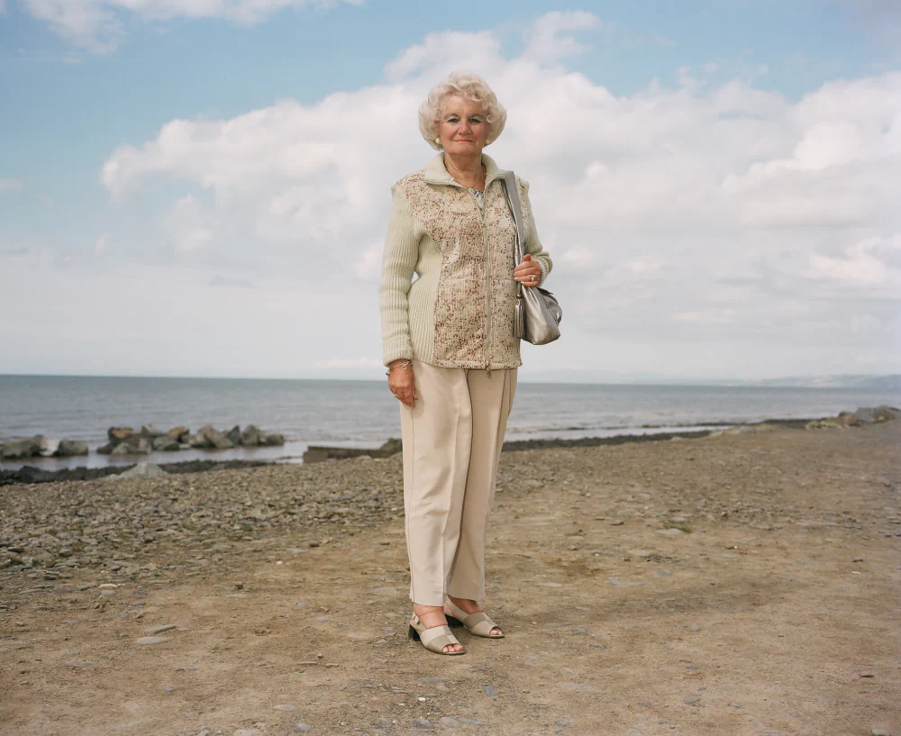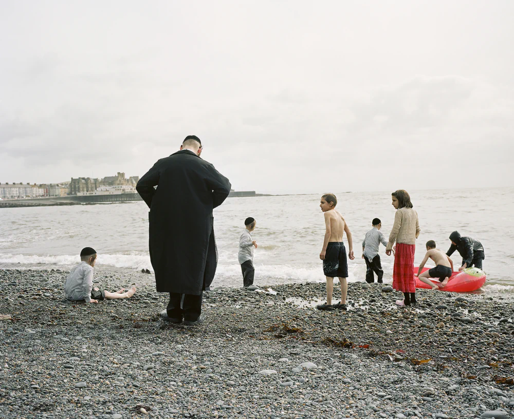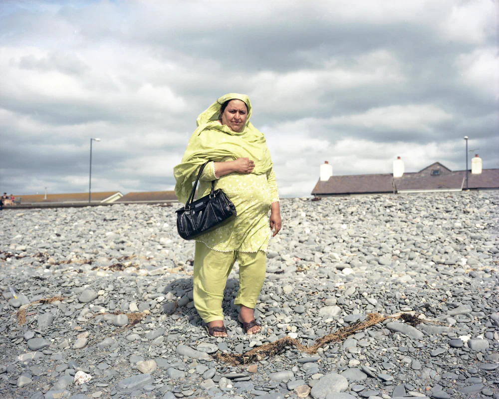 Brought up during the apartheid era, Sank left South Africa in the late 1970s and, a decade later in 1987, moved to Britain. Her upbringing in South Africa has, she says, given her an eye for the unusual, especially when faced with the “greyness of the rocks, the sand, the man-made monuments.” Finding colour in bleakness captures an idea at the heart of a British summer: a liking for a little hardship. In one image, a woman in a yellow salwar kameez stands on the rough, pebbled beach beneath a pebble-coloured sky, bracing herself against the wind. Sank recalls that the woman and her family, visiting Borth from Wolverhampton, were playing ball games on the beach. This is heroism.
