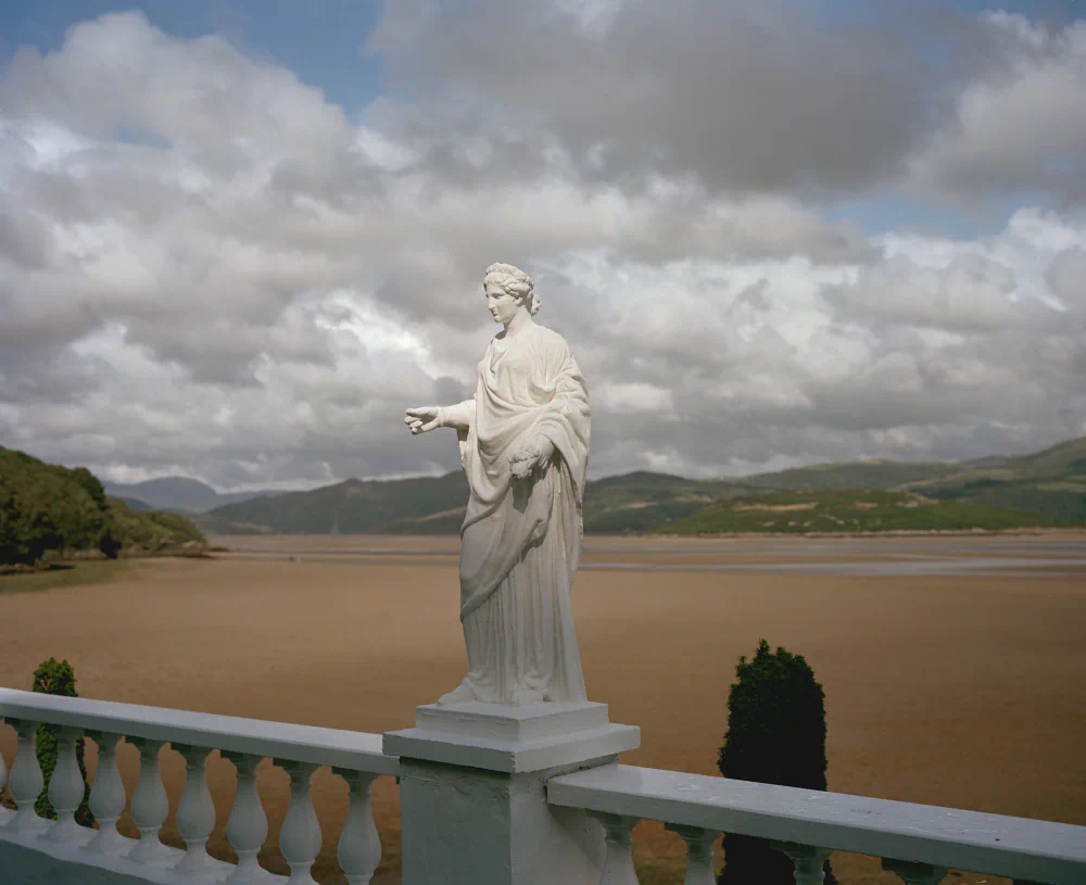 So, for all the battened-down skies, these images are celebratory. Four children running up a verge, their arms caught mid-sprint and pumping the air, evoke the spirit of Henri Cartier-Bresson—a decisive moment captured. Whatever they have seen over the hill, it is something miraculous. Then there is the Roman-style statue standing before dark sand and cloud, its torso lit by sunlight. This image was taken at Portmeirion, a place built by architect Clough Williams-Ellis in the style of an Italian village. He wanted to prove that it was possible to build beautiful—and colourful—housing without defiling the natural landscape, a project not unlike Sank’s. The statue is incongruous, yes, but it also plays into the central motif of the work: something miraculous emerging from the gloop.