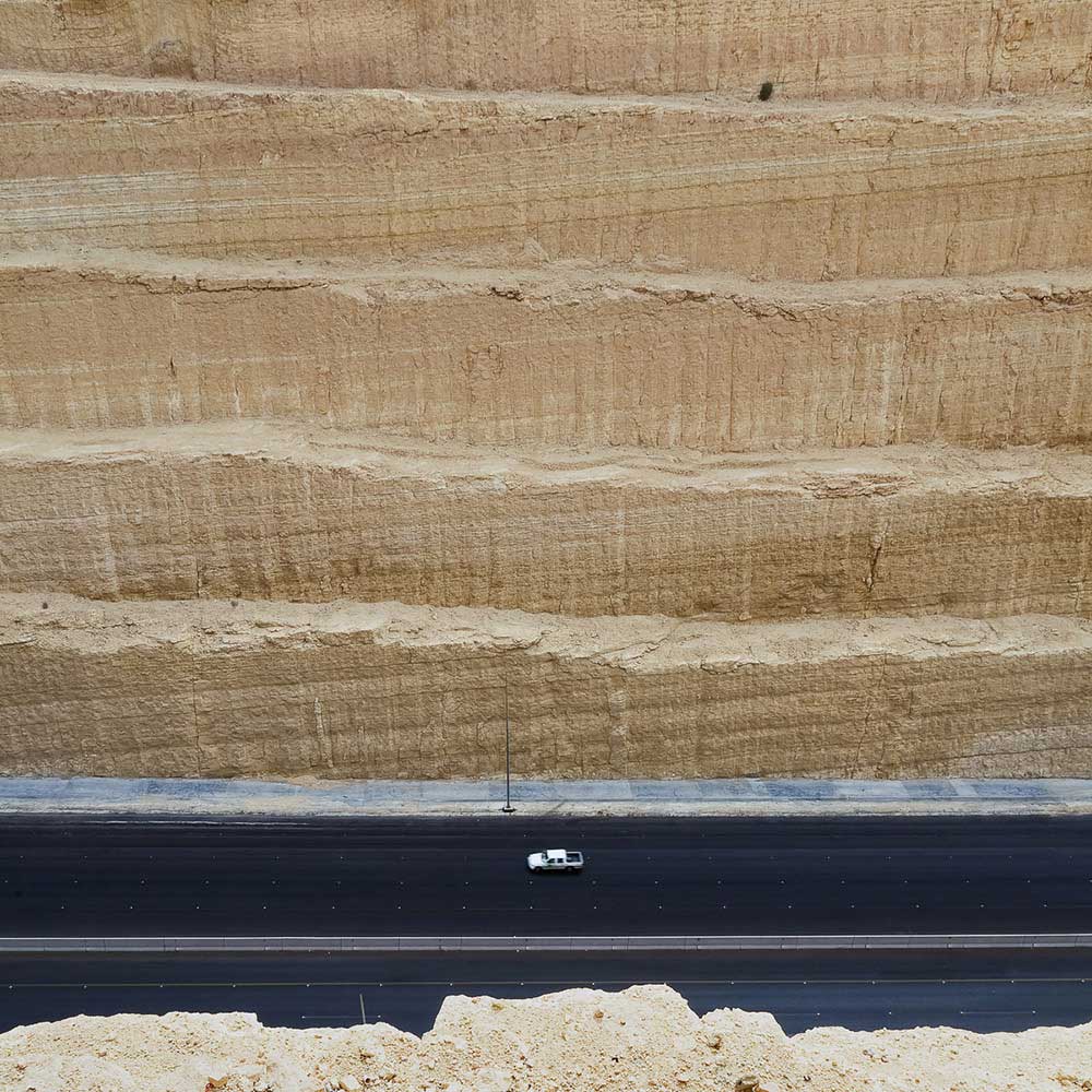 Although this itinerary may be somehow reminiscent of the 19th-century grand tour, in Min Turab the attention is not focused to the most popular sites of photographic pilgrimage but in the opposite direction. The areas to study point to the newest centers of unbridled urban development with an approach from the outskirts, the periphery, and the back alley. ‘Min Turab’ steps back a few miles and takes in his secondary, less privileged view, addressing towards the ‘small’. Apparently anecdotal details, at least in this case, end up being the most meaningful of all. Taken together, the project, developed from 2009 until 2017 calmly scrutinize the exact places where landscape alteration, linked to oil as a main agent of change, has produced a fatal discord, a sort of friction that destroys earlier visions and ideas of a place: the notions that we might have as uninformed foreign spectators, or that locals might have as they deal with landscapes transforming rapidly before their eyes—landscapes that, for the first time in history, they will outlive.