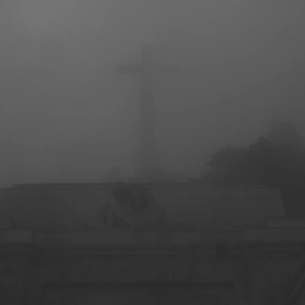 Mist plays a central role throughout the sequence. It functions not merely as an atmospheric condition but as a conceptual device. The fog obscures edges, flattens depth, and dissolves hierarchy. The colossal cross—designed to dominate landscape and consciousness alike—loses its visual authority. It remains visible, yet unstable, as if its claim to permanence were eroding before our eyes. In this sense, the mist becomes a metaphor for historical reckoning: a space where certainty dissolves and meaning must be actively questioned rather than passively received.