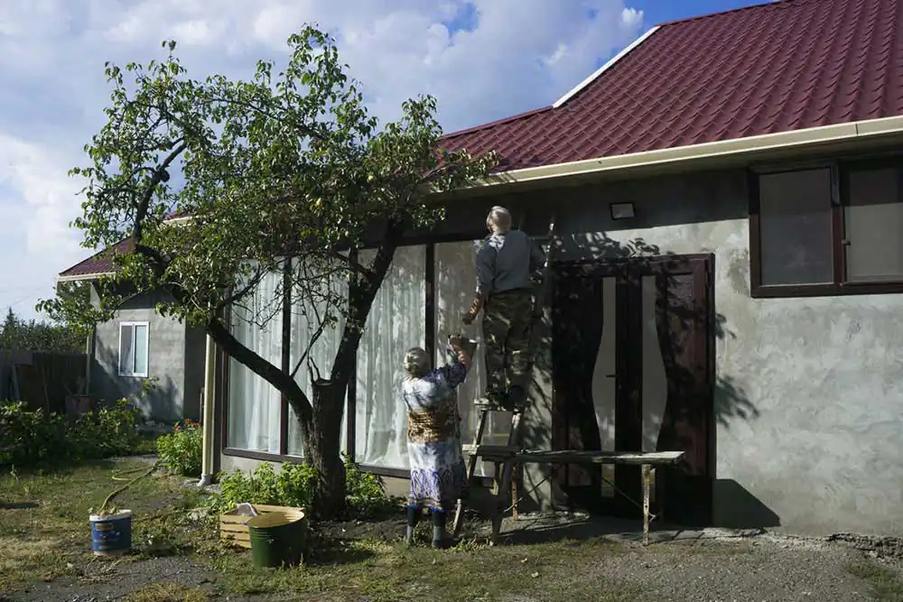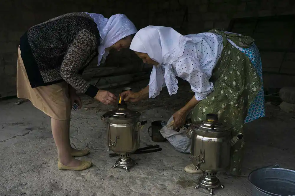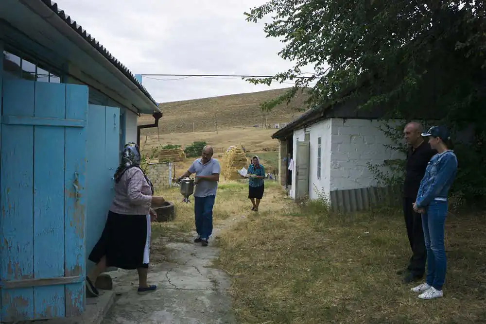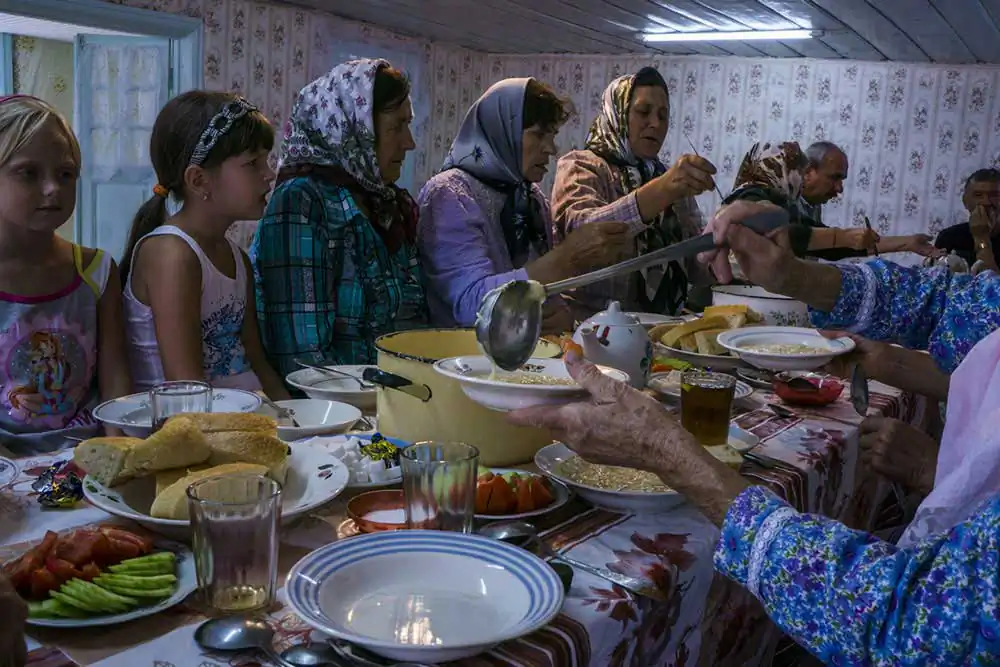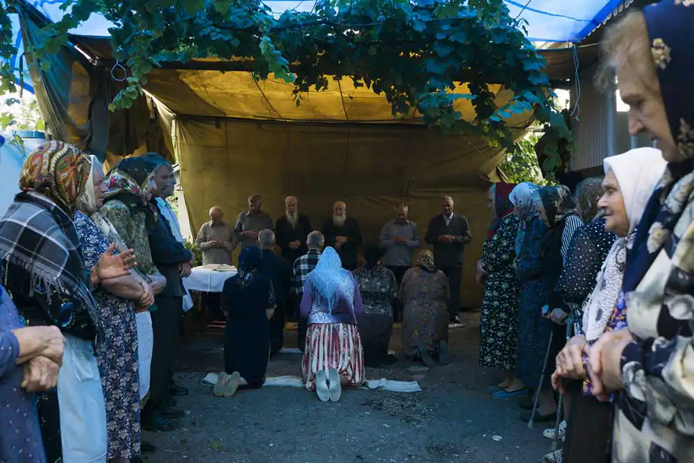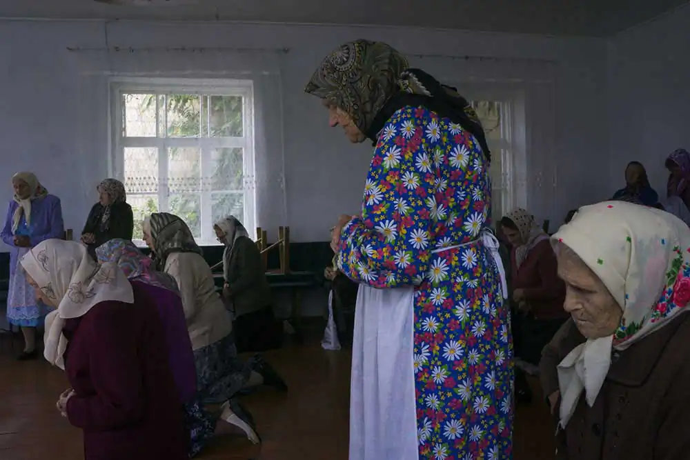 An elderly Molokan women from Khimilli treats her grandsons to compote. They eat Qutab – a kind of pastry stuffed with potatoes or tripe.A wedding in Ivanovka. Many of the subtle customs have been forgotten, but the elderly residents of the village still remember how weddings used to be. Anna Ivanova Lebedeva recalls, “All the relatives come and bid their farewells. More attention is given to the bride as she has come to another house… And so they all say goodbye and beautiful words are spoken… and then they leave. They leave, and then the groom and his bride seat those who helped to set the table.”Molokans gather pears to be baked on a Russian stove. Sun-dried pears are also popular.Before, by the age of 16, each Molokan had to have a dowry ready: embroidered sheets, pillowcases, handkerchiefs and towels. If a girl did not have time to cope with the work herself, her friends would help in the evening. There are pillows with the embroidered initials of the craftswoman in every house.Molokans light the samovar for drinking tea during a festive gathering. During festivities, it is customary to wear something white, such as a head scarf.The main treat during the festive gathering in Khimilli – a traditional Molokan dish of noodles in a meat bouillon. Whilst the dishes on the table are being changed from one to another (after the noodles come dolma and cabbage rolls), the Molokans sing psalms.A day before the funeral, a memorial service takes place. Elderly Molokans do not use modern technology, but amongst the participants of the prayer was a young Baptist man. To join in with singing the psalms, he found the necessary texts on the internet.A family visits an ancient Molokan cemetery in Khimilli. The woman standing by the gravestone is the only member of her family to still live in her native village. Relatives from Russia visit her during public holidays and vacations.Many Molokans offer domestic animals and birds including turkeys. In the evening, they are taken into the aviary.Several of the Molokans who live in Ivanovka work on a collective farm. They are paid barely anything for the harvesting of grapes, but they are allowed to keep some of the berries they harvest for themselves.Mikhail Mikhailovich Kastryulin, the elder of the village, Chukhuryurd, takes the birds “vitamins” – cabbage from his own vegetable patch.Returning from the service, elderly Molokans pass a bus stop from which the residents of Ivanovka can return to the centre of the region, and then back to Baku. Buses are infrequent, but from the centre you can leave by taxi. These services are mainly operates by Azeris, who also sell fruit on the outskirts of the city.Many Molokans work in village agriculture. The main form of employment in Ivanovka is with the local collective farm. It is forbidden to burn grass and garbage in the fields, but it is cheaper to burn than to take away, therefore lighting fires in the fields is not uncommon.An elderly couple from Ivanovka. The wife helps her husband tie his shoelaces, which he is unable to do due to problems with his health.The shapes of gravestones for men and women in Molokan cemeteries different from each other: a semi-circular headstone symbolises a head, indicating that a man has been buried there. A triangular headstone symbolises a dress, therefore indicating that a woman has been buried there.Every Sunday, the gathering of Molokans finishes with a special prayer which is said whilst kneeling.The the end of the working day at the collective farm in Ivanovka – Russians, Azeris and Lezgins drink tea. The chairperson of the farm has come to talk to them.They are preparing the commemoration feast together. Again the main dish is the traditional noodle dish served with meat bouillon. They cook it in a 50 litre cast iron pot.For many Molokans living in different villages, the funerals of relatives are the only times that they see each other for long periods of time.Catherine Ivanovna Kastyulina – the wife of the elder of the village Chukhuryurd is resting at home. On the day when the photo was taken, commemorations were taking place in the village, which added to the usual worries and anxieties of domestic life.The samovar is taken into the house for gatherings. A young woman observes the table being set. She came from Russia to Khimilli, where her parents grew up.