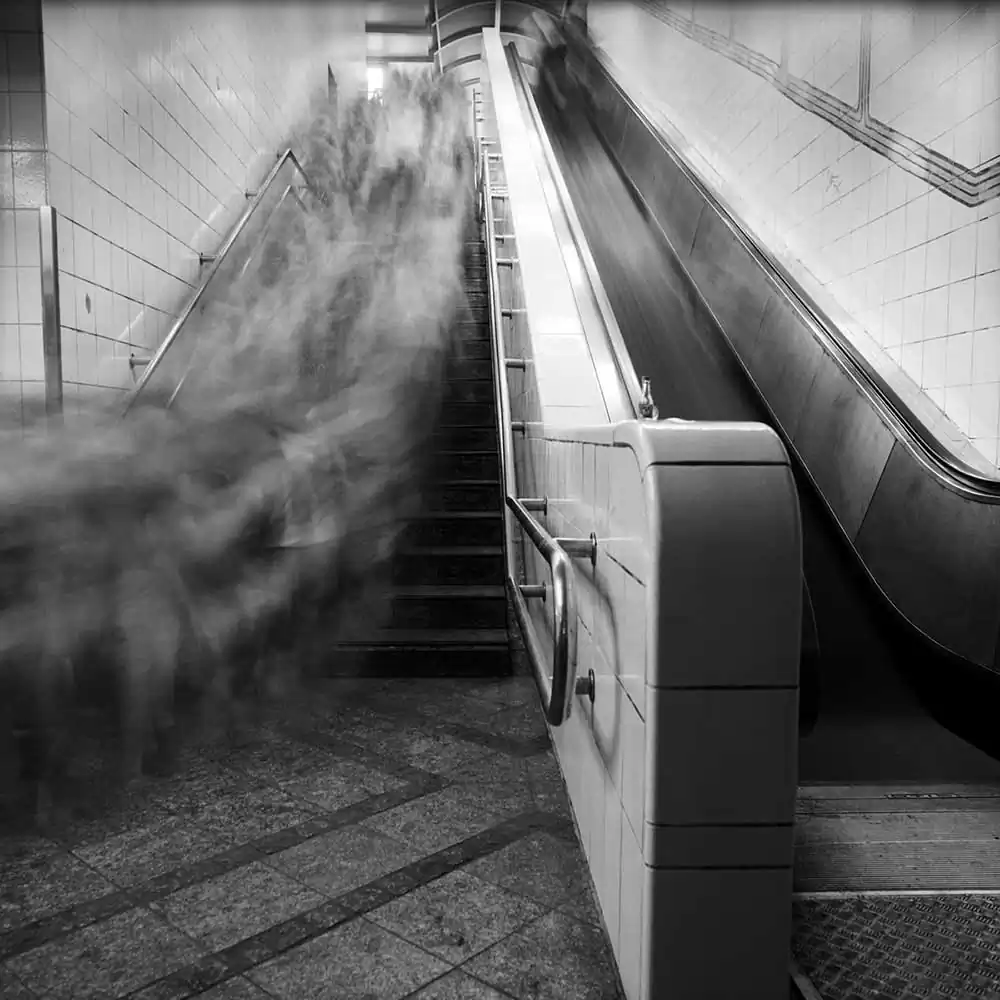 The feeling of walking through busy streets and becoming no more than a small part of the city. The feeling of being unrecognizable and disappearing in the crowd, almost as if one loses all kinds of individuality and melts in with the masses. In his series “monster” the artist tries to express this feeling by taking pictures with a long exposure time of busy places within a city such as an underground station or an airport. Because of that the people moving around the places become blurry and appear like “a uniform monster”.