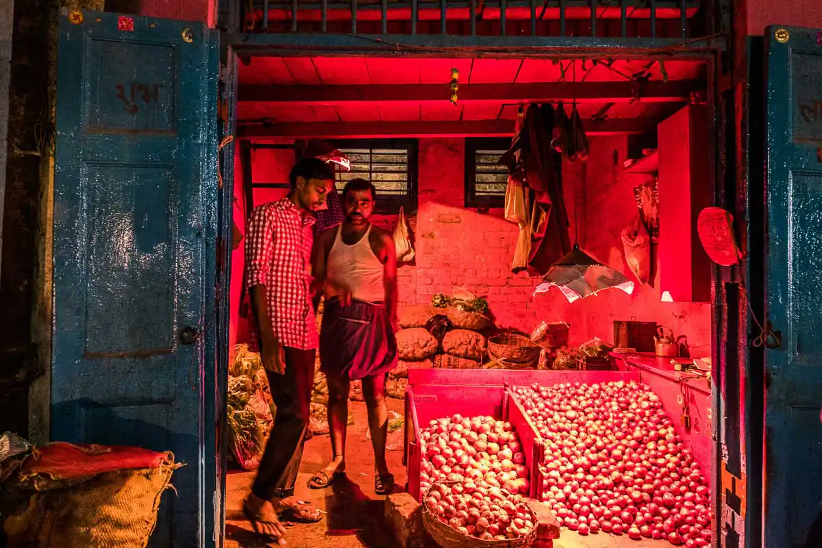 Vendors in these markets have an interesting technique to make their vegetables look more attractive. They cover their lamps with tinted cellophane which makes the color of their vegetables more intense and vibrant.  The vendors themselves also become transformed. So, sellers of tomatoes become a bright shade of red while those hawking cucumbers look like jolly green giants.  It is eerie, frightening and beautiful all at once.