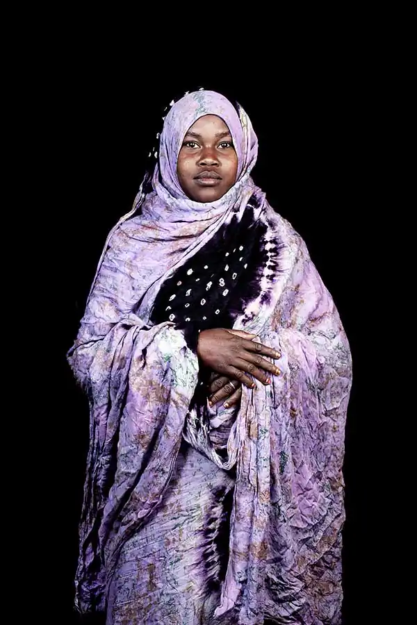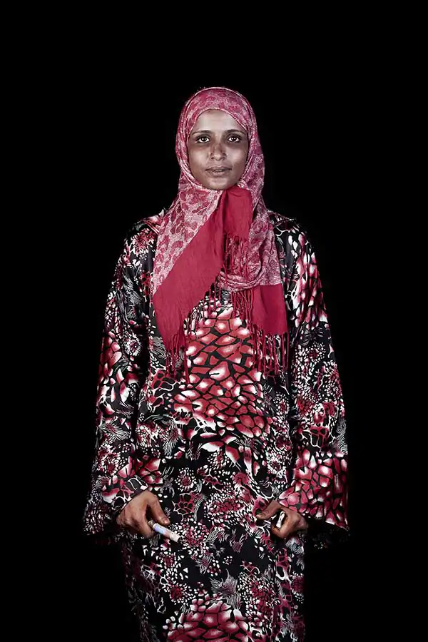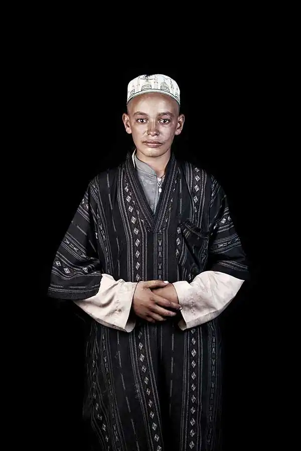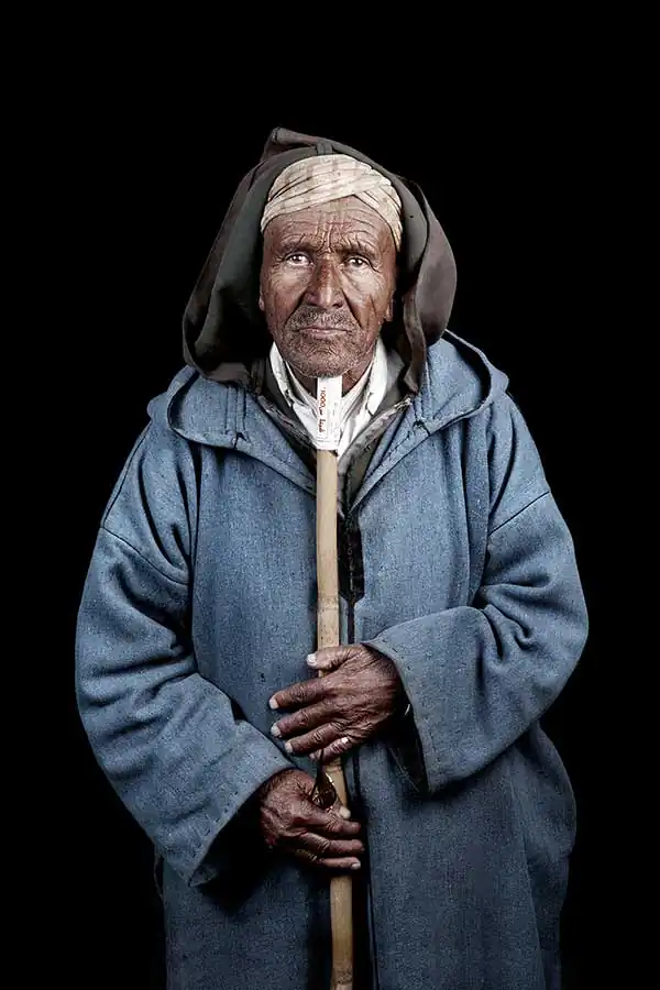 Since many Moroccans have rarely been photographed in this manner, no direction was needed as they naturally strike the same straightforward pose, looking intensely into the camera. Intimated by the burst of the flash, they automatically step out of the studio after the first click, leaving me only with a one shot opportunity. I also chose to photograph Moroccans isolated from their environments in front of a black background with artificial flash lights, using techniques of studio fashion photography rather than classical lighting often used in travel photography. My approach follows a more contemporary aesthetic, with strong artificial lighting and a sharp depth of field that brings out the intensity of details. I favor cold color tonalities to contrast with the warm and exotic natural colors of morocco. I also chose to photograph all portraits using identical lighting and framing to create a visual unity.