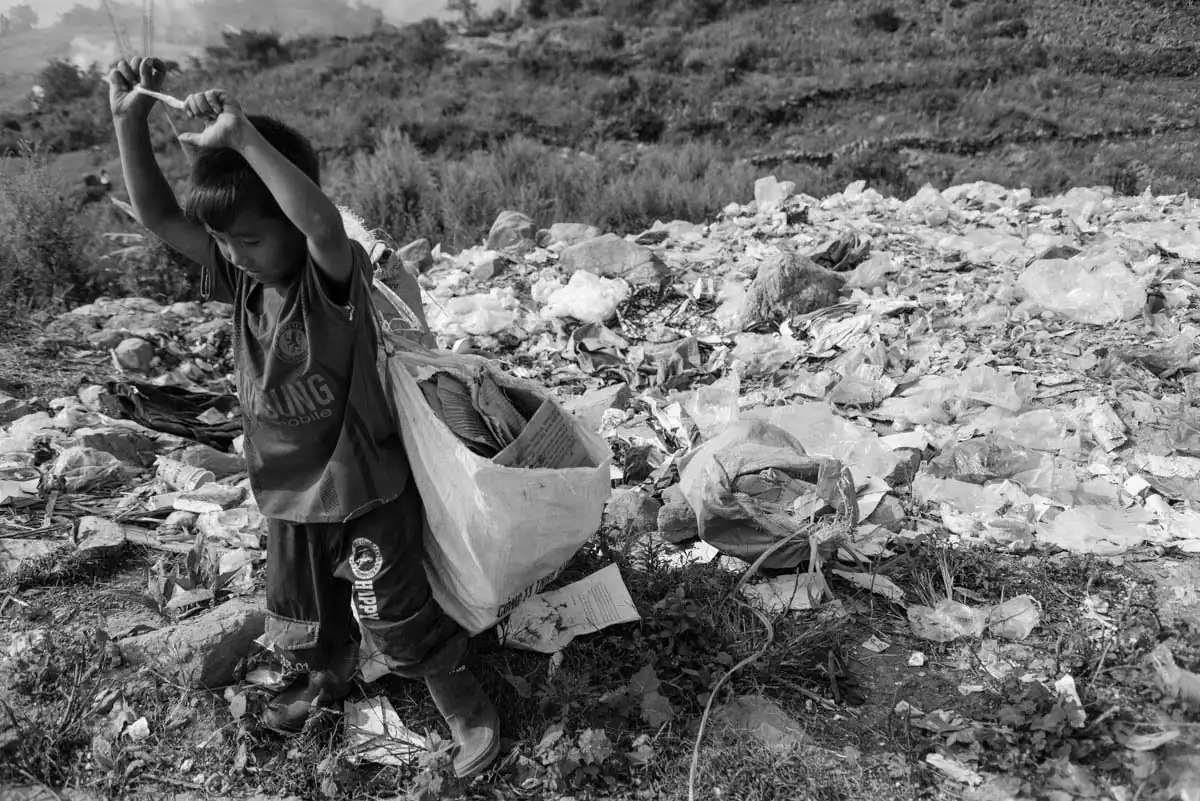 A boy collects paper trash in order to sell it for about one dollar per kilogram on a nearby market. This way he helps to support the family’s income.
