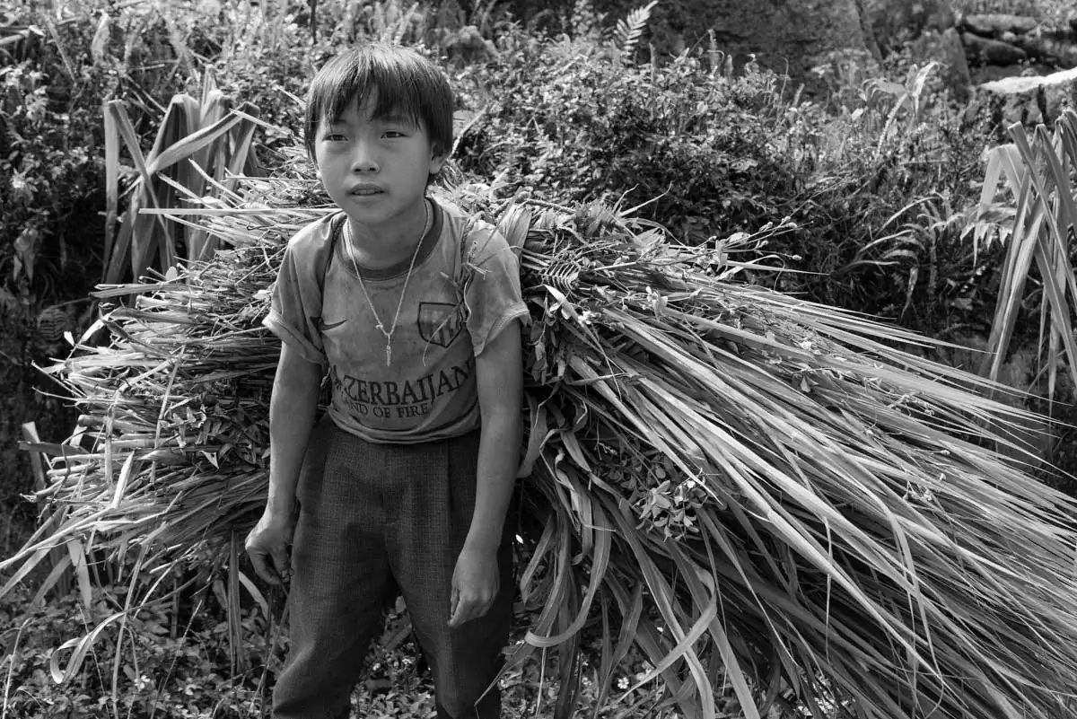 A boy is carrying home his crop, that will serve as food for the family's animals. Cane is one of the most common agricultural products in Ha Giang province. Because of its karst topography in certain areas it is very difficult to cultivate rice or grow vegetables.