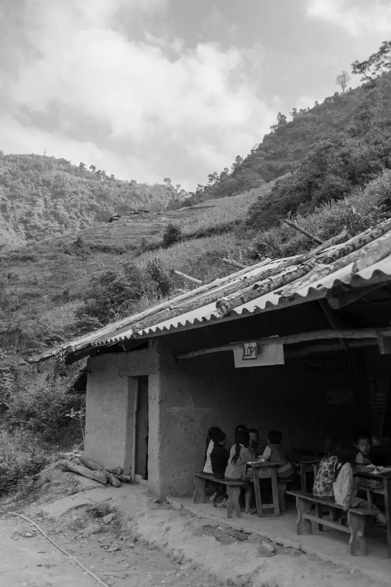 View of a primary school. In the remote mountain areas many schools use cheap, natural materials, such as clay for their buildings. But some schools still cannot afford proper walls. Pupils are exposed to weather conditions even in winter, when the temperatures fall below freezing point.