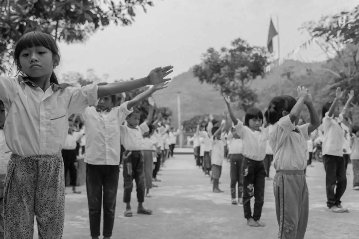 Children are performing to a Communist Party of Vietnam’s song that is played every day at school. Most of the children do not understand the meaning as their mother tongue is not Vietnamese.