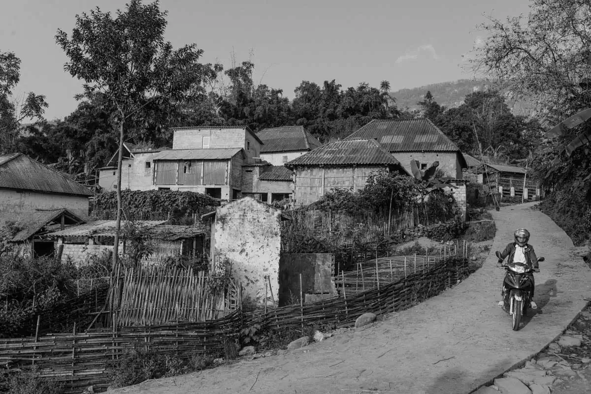 A man rides through his village on a motorbike. Motorbikes are necessary means of transportation and bridging the long distances between remote villages and towns along the mountains.