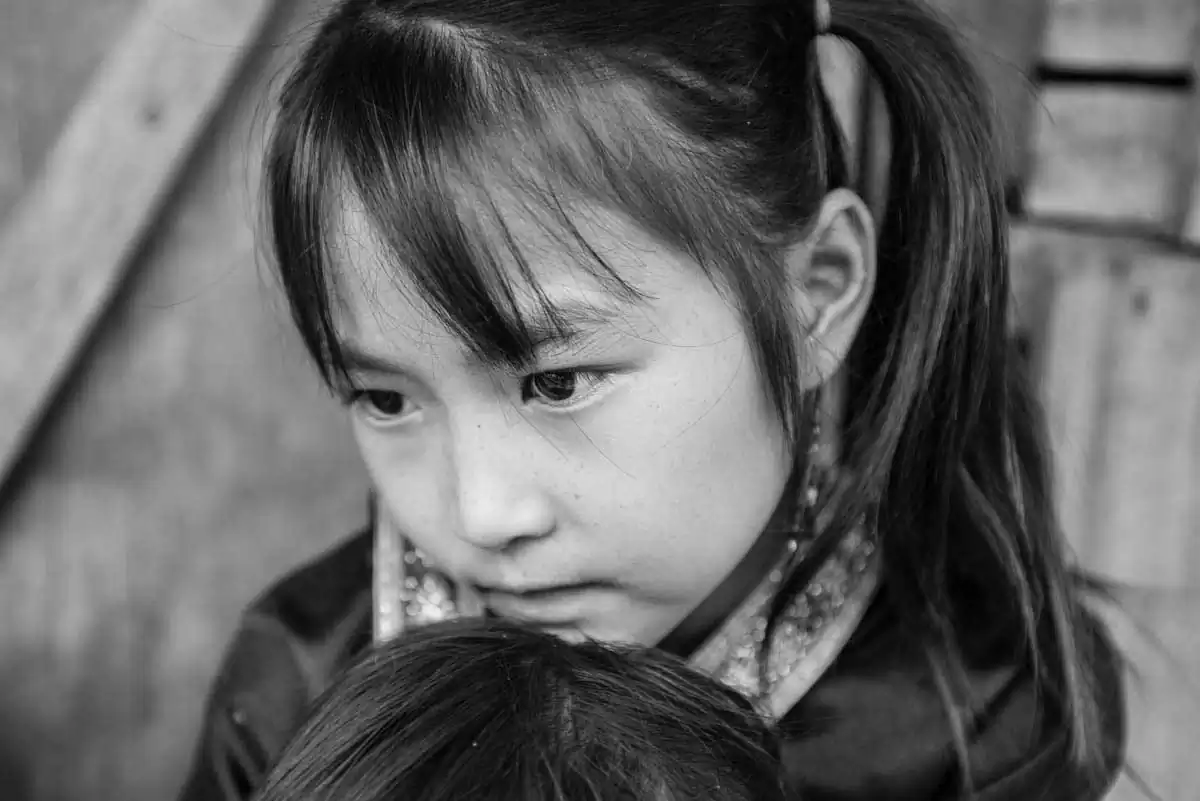 A twelve year old girl is taking care of her relatives during the day, while their parents are working on the fields.