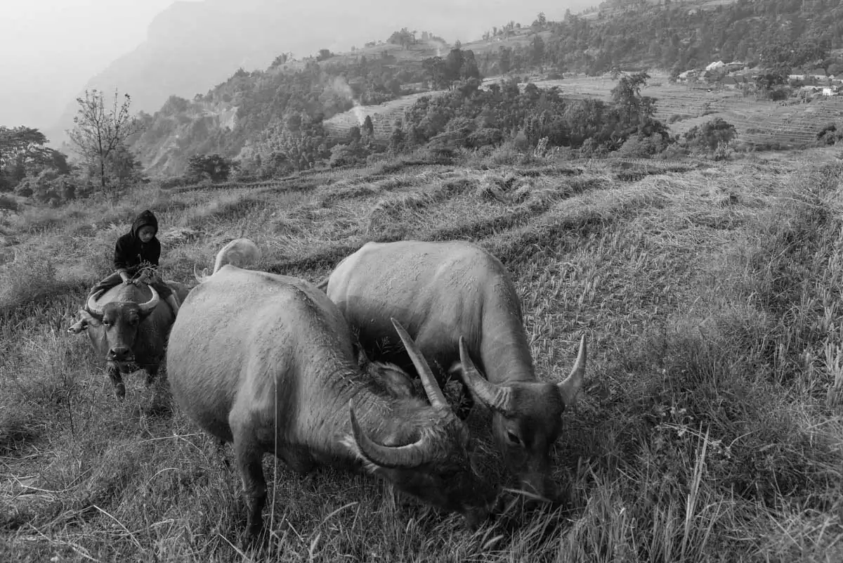 A boy takes care of the family’s herd of water buffaloes while his parents are working on their field.