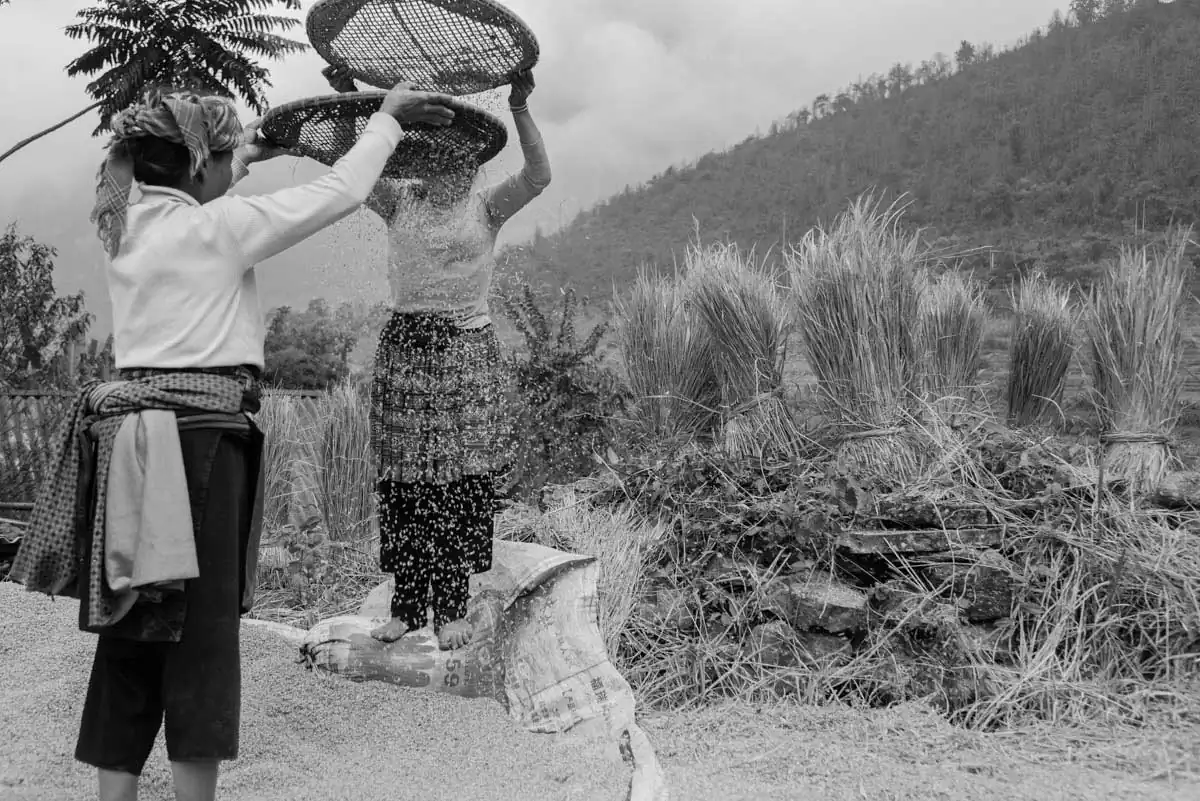 Women are using baskets to separate rice grain and straw as part of their harvest work.