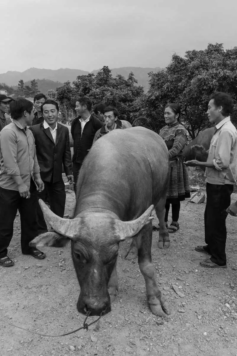 A group of people is negotiating the price for a water buffalo on a local market. Buffaloes can serve as farm animals as well as an investment, with prices ranging up to $2000.