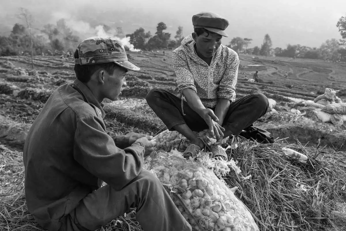 Two men are peeling garlic to plant the seed as next year’s crop.