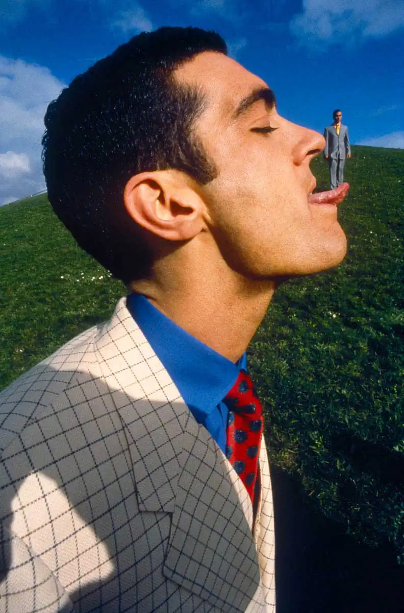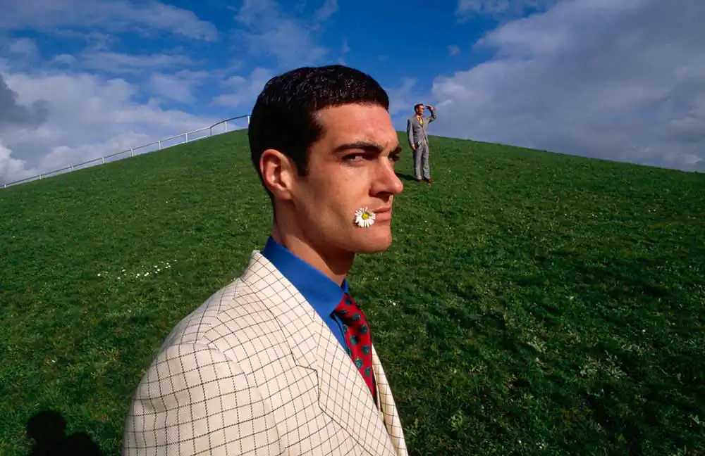 Back at the bottom of the hill, I was setting up the shot with the model in a white jacket, trying to get the background model in the correct position next to his head, when he stuck out his tongue. I thought it would be interesting if the model would appear to balance on his tongue. I always go to shoots with ideas but I am always open if something interesting turns up. There were daisies in the grass all around, which suddenly brought to mind a Henri Cartier-Bresson photograph I had seen, of an old man with a flower in the corner of his mouth. I decided to do something similar. I preferred the shot with the tongue and did not use that one.