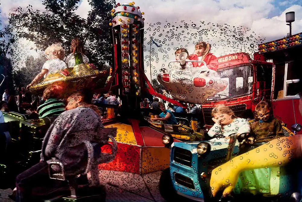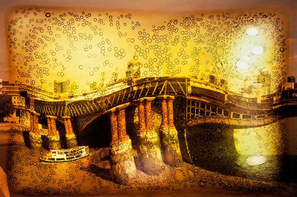 I rarely used this style for commercial work but employed it on my walks around London and sometimes on my road trips around the UK. I have pictures of the white cliffs of the south coast, bathers on the beaches of Devon and Cornwall, farmers and sheep in the Yorkshire Dales, narrow gauge railways in Wales and so on. I would often end up on the coast in order to see the sea at least once a year. I would drive and stop when I saw something interesting. I did not have to wait for the right light because the technique would possibly ruin the frame anyway. I called them my “holiday snaps” and over the years I would process them as the mood took me and stick them in my files. After nearly thirty years I thought I would haul them out into the light and reassess them. They were always brittle and fragile and just blowing them with compressed air to clean them, as photo labs used to do, could blow a hole in them. I found some of my favourites were damaged with burst bubbles after being squeezed in files all these years and I had to digitally restore some of them.
