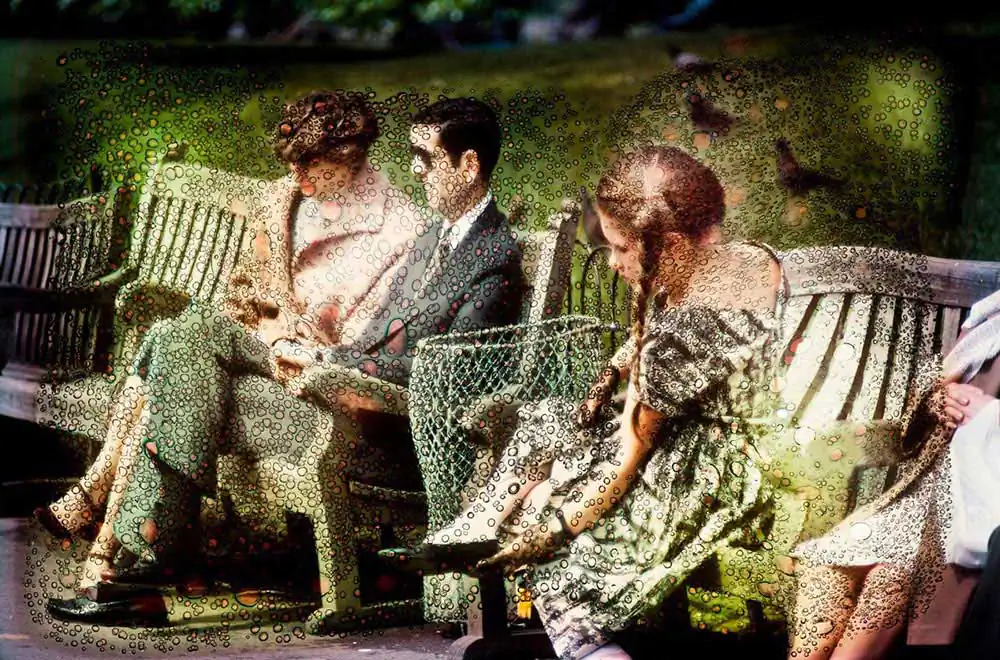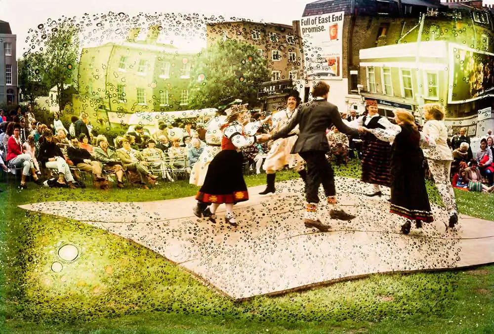 My Neo Pictorialism began when I started experimenting with altering the film emulsion. I tried different film stocks and different ways of applying the technique until I came up with an optimum combination. The bubbles, the distortion and the colour shifts appeared all at the same time. I had some control as to where on the frame to apply it but not much. What I liked about it was that it was like alchemy and could turn an ordinary picture into gold but conversely it could totally destroy a good one. I had to work on the originals and many would go in the bin because they disintegrated or they just curled up. I also could not do too many at once because of the noxious fumes the process created.