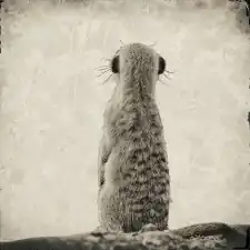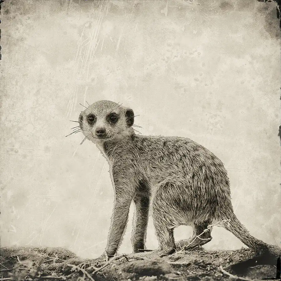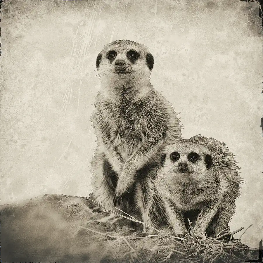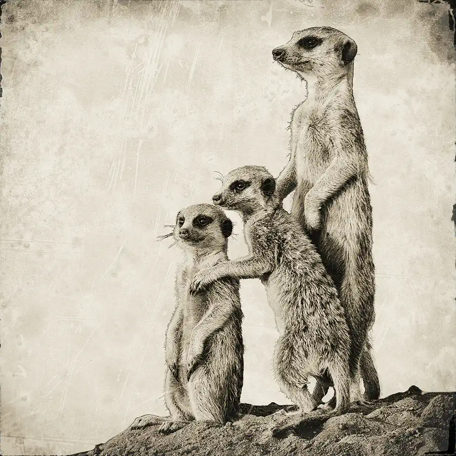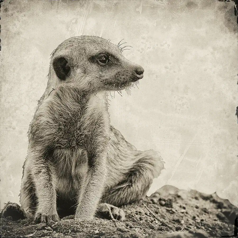 I am from an arid area of Africa and my recent project is much closer to home. The Kalahari and arid areas surrounding it is the habitat of small animals called meerkats.  They are specially adapted to living in the harsh desert environment. Dark patches around their eyes help them to be effective lookouts by reducing the glare of the sun, much like a baseball player who paints dark lines beneath his eyes. Their eyes also allow them to take in a wide angle view of the scene. This helps prevent predators from gaining an advantage by sneaking up. These animals further function in a closely knit family structures in which only the dominant couple in a meerkat family are allowed to produce pups. All the other family members however are actively involved in babysitting the pups. The family members will also give their lives trying to protect the young ones.  I am now busy working on a series of images where I want to portray the concept of being a family unit amongst these animals. I am utilizing portraits of  meerkats which are processes to look like old family photos. Hopefully these images will create an awareness of these animals to a broader based audience than what the standard nature photographs will do. [Official website]