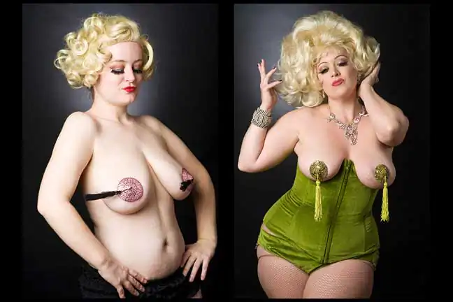 These photographs further present the spirit behind each performer and the individual approach taken in the art form of burlesque. Nudity is a secondary element to the art and the individual. The photographs exhibit an honest grittiness, capturing a diverse array of body types portraying confidence and comfort in one’s own skin rather than an airbrushed representation of fantasy. In addition, American standards of female beauty are being challenged and turned on its head. Here all body types are welcome and accepted…what is important and exciting to the audience is that the performer is comfortable in their own skin, not whether or not they have that airbrushed show girl look.