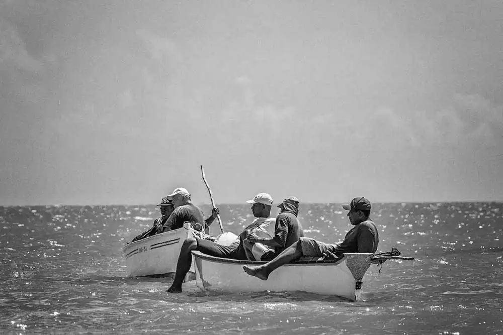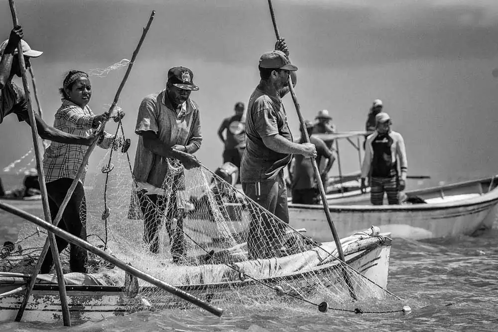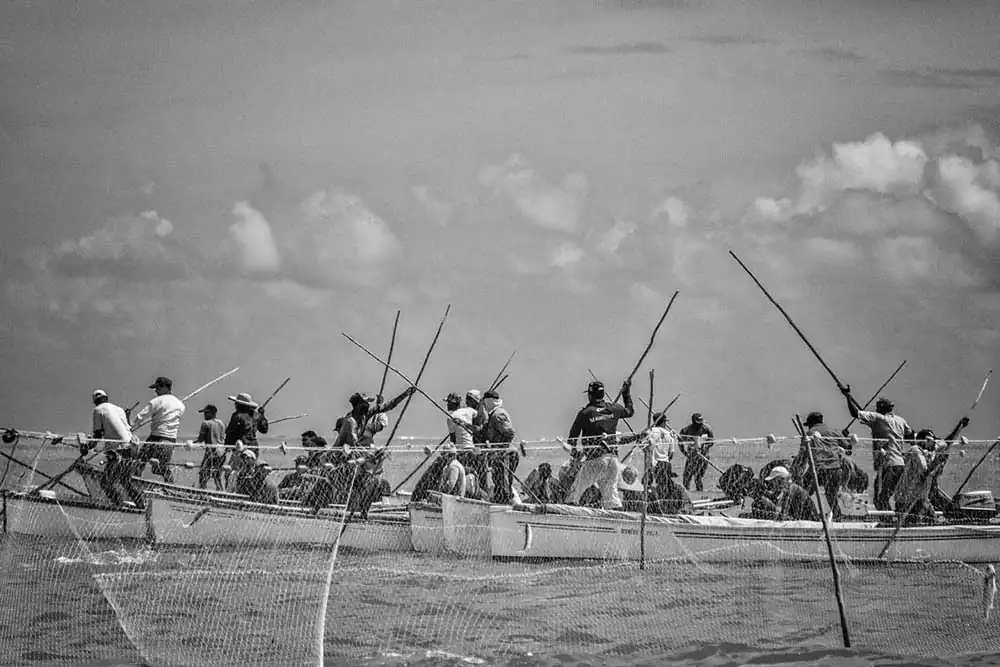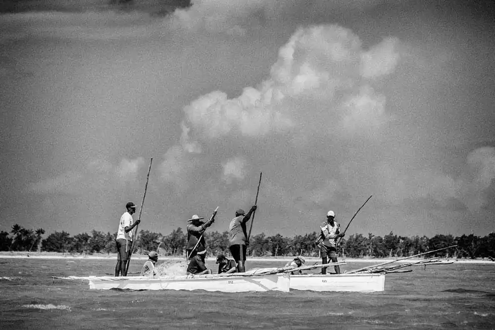 Every year, on the 1st of March in Rodrigues island in the Indian Ocean, the net fishing season in launched. Groups of fishermen and women join forces and set their nets in the wide lagoon to catch fish. In their pirogues, (wooden canoes) they drive the fish towards the nets by banging on the sides of the boats and on the water.