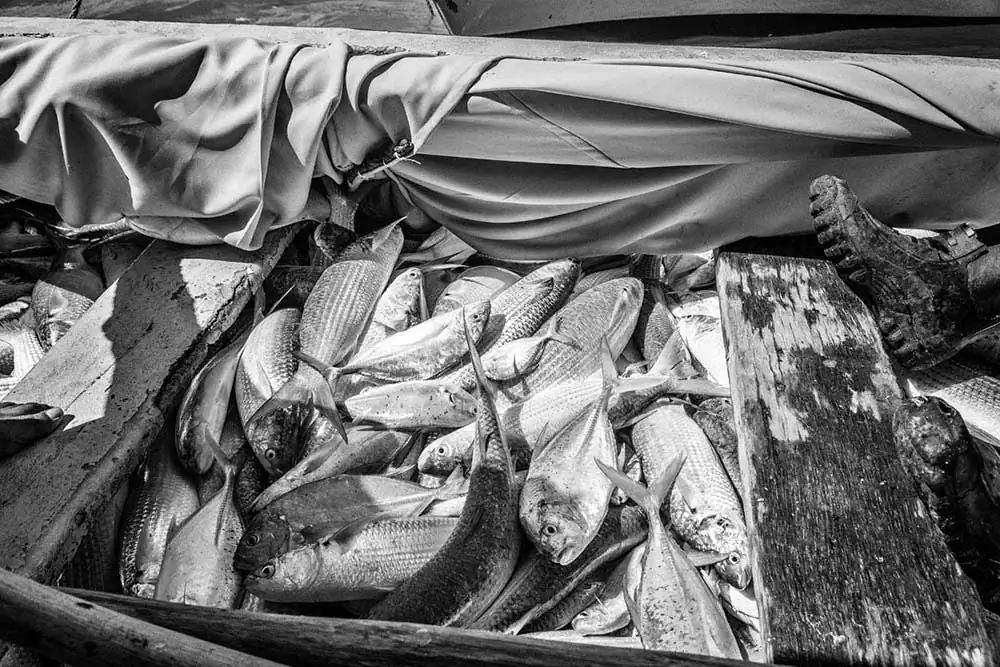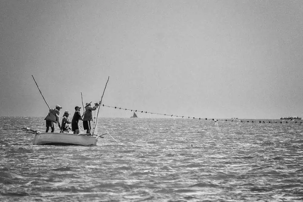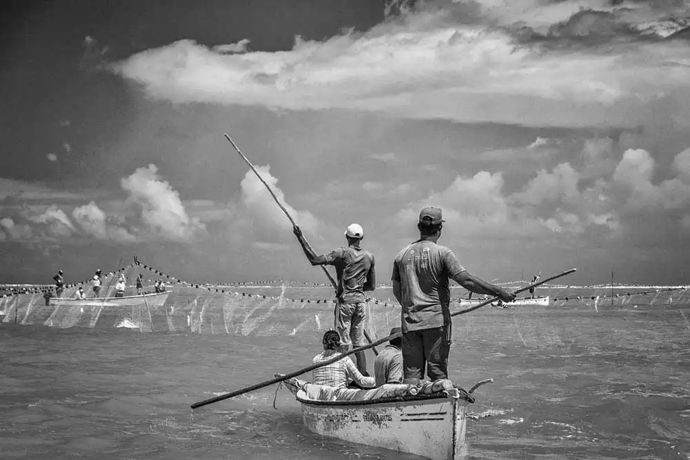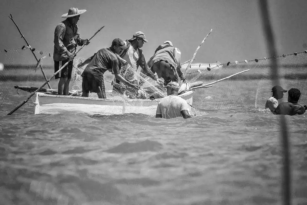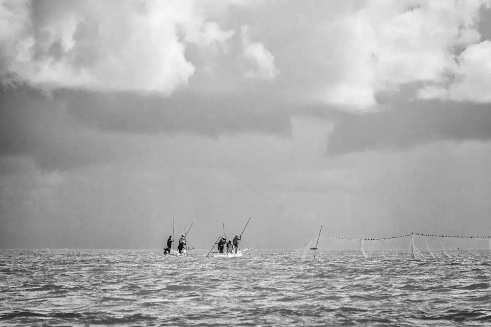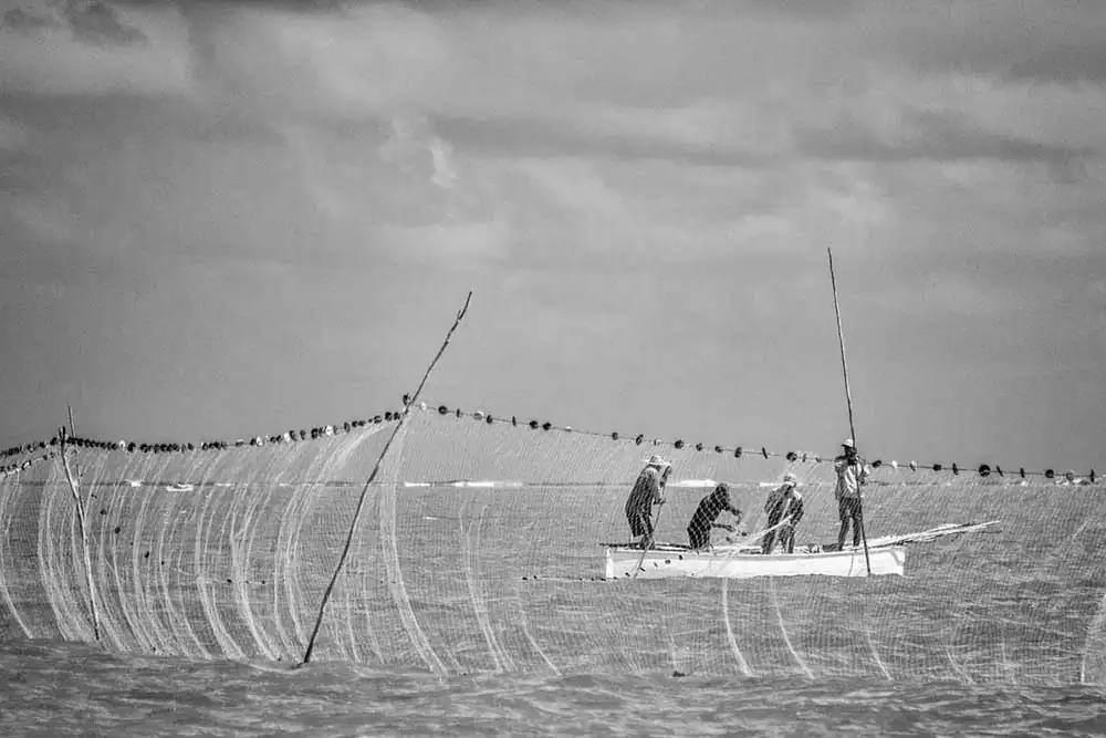 This is an extraordinary opportunity for photographers to catch some stunning shots. The nets are placed by a team while the other boats sail about a mile away where they gather and start pushing the fish towards the nets. As the boats approach, the mullet fish start to jump in or above the nets. This gives the photographer fantastic images to freeze on camera. Suddenly, the fish start to jump all around, and the fishermen are shouting orders. A sort of frenzy takes place as the nets are getting filled with fish. One needs a very fast shutter speed to capture the moments 1/2000 secs. I switched from my 18-250mm to a 500mm to get the most of this experience. The photographer being also on a moving boat makes the shots more delicate and difficult. This event happens very quickly, and one must be ready to shoot without hesitation. Then its time to bring the nets back in the boats and the fish are sent into one of the boats going ashore. Then the nets will be placed again in another part of the lagoon and the whole operation will start again.