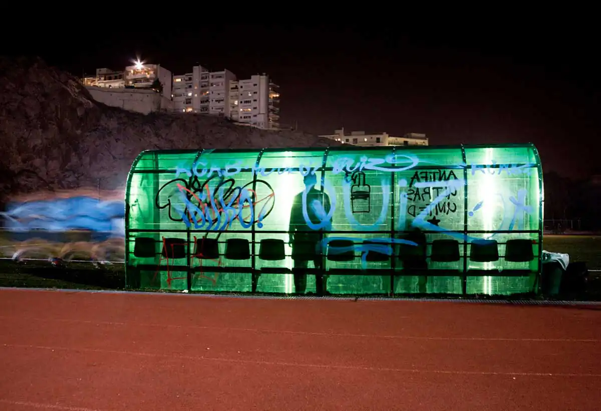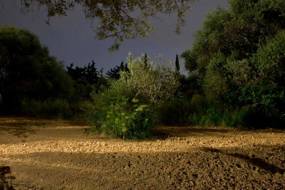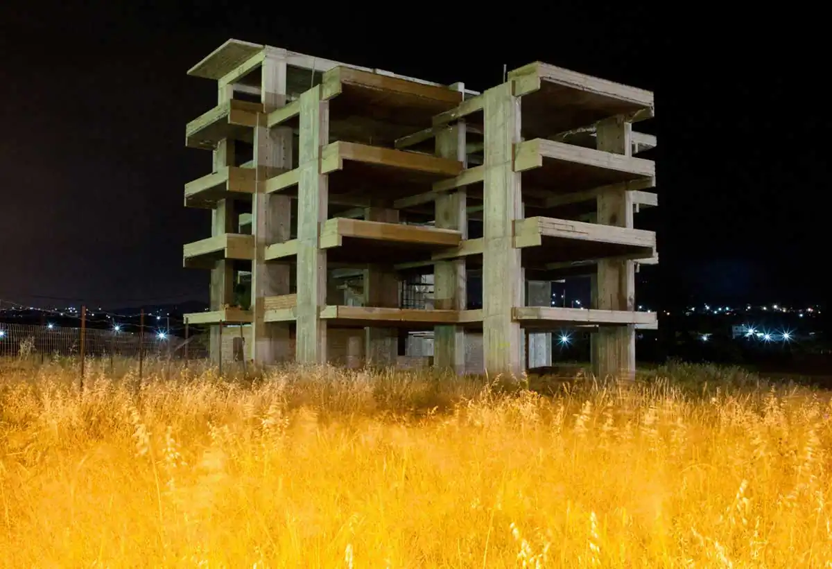 The nocturnal wandering in the borderland of the city and in the far away fields is characterised by darkness and danger. However, the fear that the night ignites is tempered by the freedom it entails. The game and the deliquency are both basic elements of the night culture. The night allows the wanderers to escape from the chores of the day and the boredom of everyday life. The night makes excuses for the purposeless wandering and the wasting of time. It happens a lot to be able to see more clearly in the darkeness than in the day light; It happens a lot to the night wanderers to reach their limits and to reconsider them. On the opposite of the whiteness and transparency of the day, stands the slow pace of the night and the diffused atmospheric essence that allow the photographer to observe the landscape, its visitors or even his/her very image. In the infertile land just outside Athens, in the purlieu of the illuminated courts and fields, in the abandonded quarries, surrounding the city, in all those places there is a strange freedom, a second chance for each and every one of us.