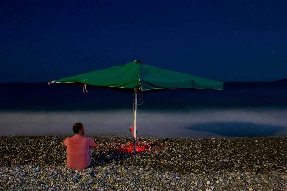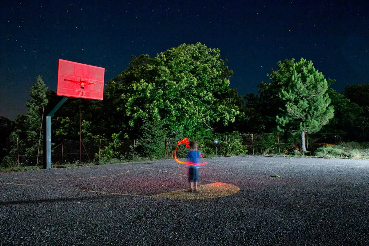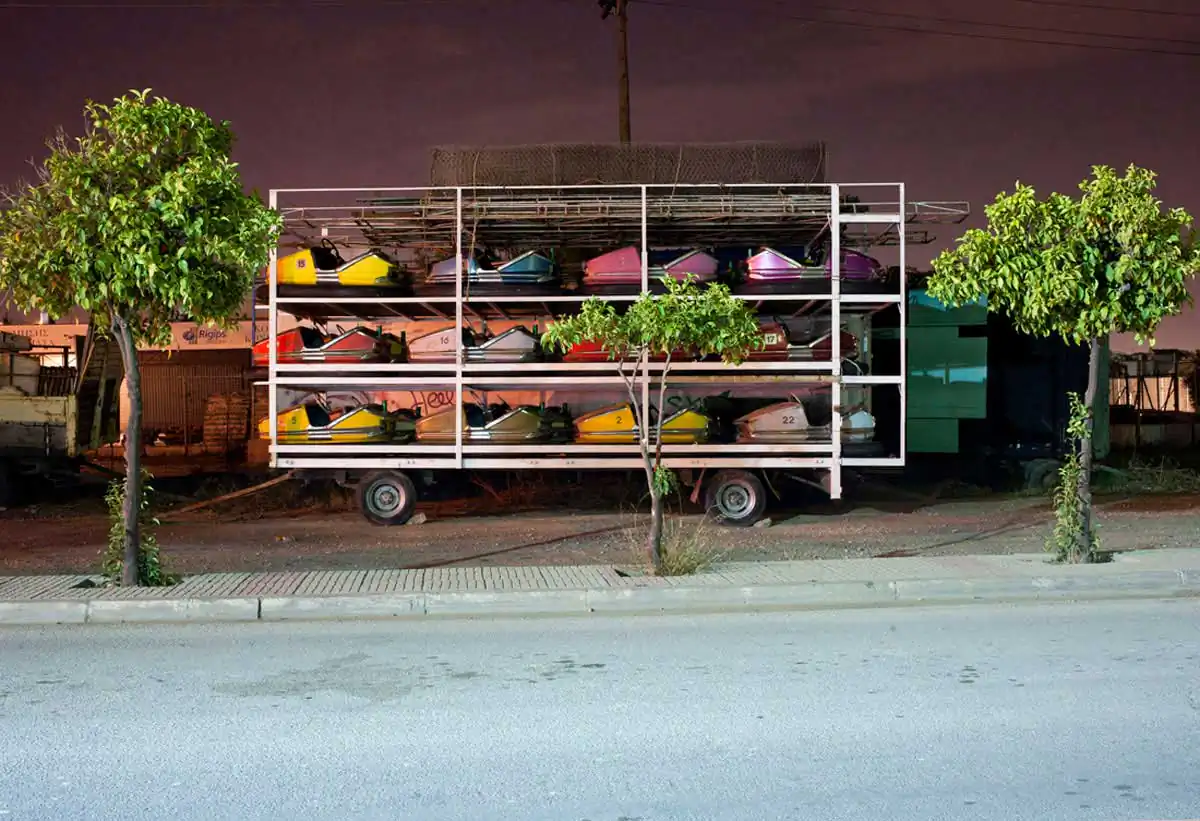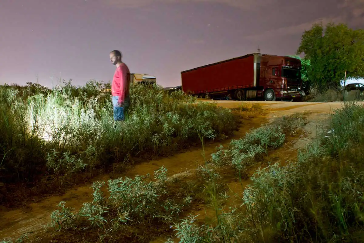 The nocturnal wandering in the borderland of the city and in the far away fields is characterised by darkness and danger. However, the fear that the night ignites is tempered by the freedom it entails. The game and the deliquency are both basic elements of the night culture. The night allows the wanderers to escape from the chores of the day and the boredom of everyday life. The night makes excuses for the purposeless wandering and the wasting of time. It happens a lot to be able to see more clearly in the darkeness than in the day light; It happens a lot to the night wanderers to reach their limits and to reconsider them. On the opposite of the whiteness and transparency of the day, stands the slow pace of the night and the diffused atmospheric essence that allow the photographer to observe the landscape, its visitors or even his/her very image. In the infertile land just outside Athens, in the purlieu of the illuminated courts and fields, in the abandonded quarries, surrounding the city, in all those places there is a strange freedom, a second chance for each and every one of us.