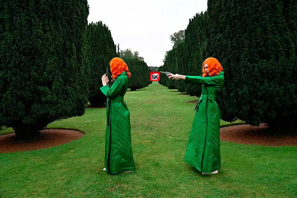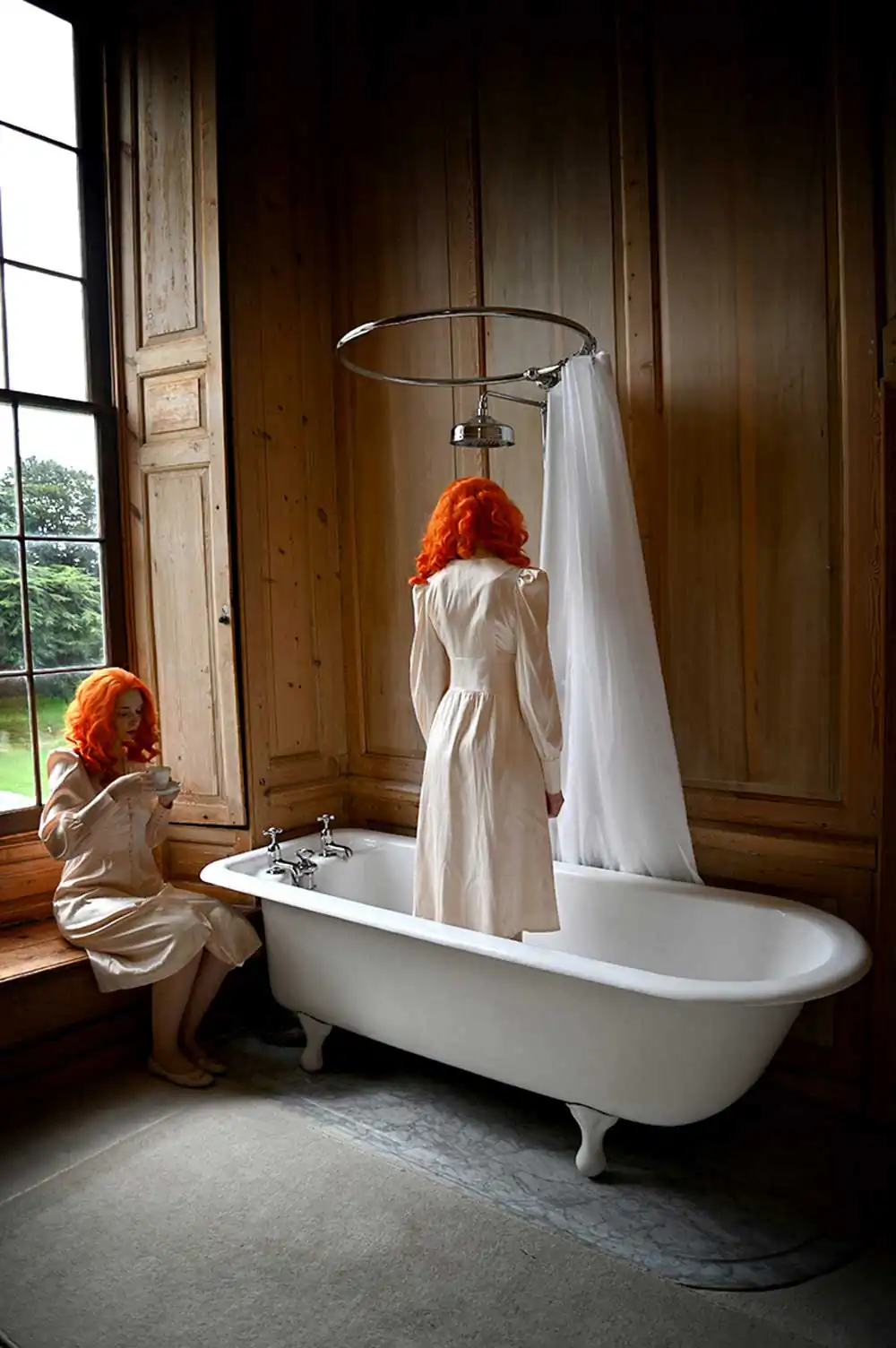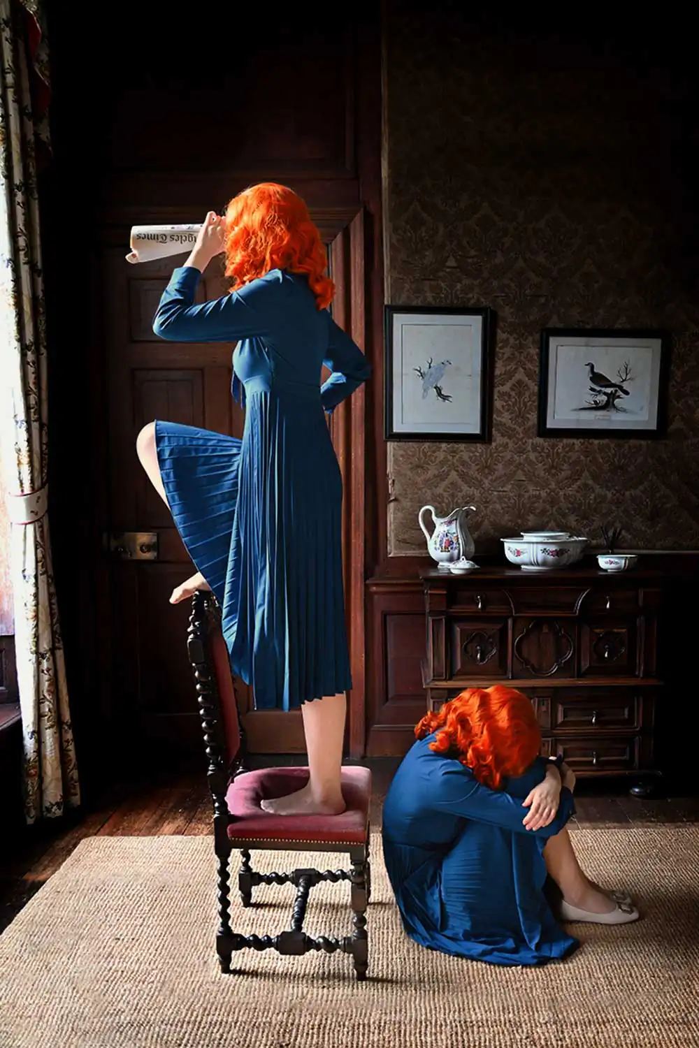 However, these miniature domestic settings also served as a tool to instruct young girls on their expected future roles within the household. The two characters in the series enact the battle between fantasy and reality inherent within the doll’s house: a desire to find comfort in the familiar home of the past, while simultaneously recognizing or deliberately ignoring the inevitable futility of such an escape.