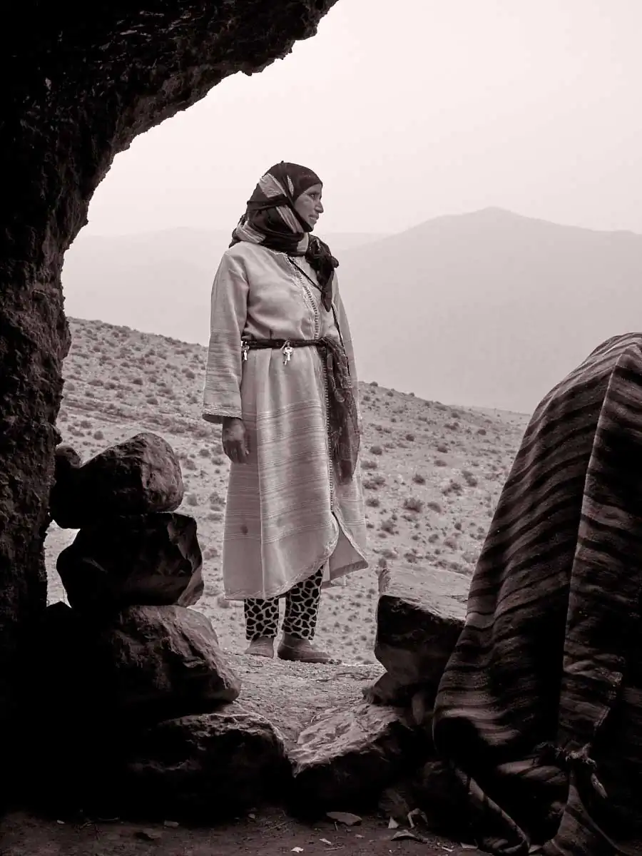 During the past year I’ve made several trips into the High Atlas region to locate families and photograph them. Women and girls have been the focus of my project. Sometimes it’s easy to find them, more often it’s a long off road drive and hike and then only through luck. Like any kind of portraiture, it’s about a connection and for a few brief minutes developing trust. For this reason I preferred women and girls for my project. The dynamic of flattery and humour sits more comfortably for both parties. There’s also the beauty of course. Women’s and girl’s eyes, make-up and clothing are hard to photographically resist. I tried to include as much context as possible without diminishing the power of the close-up. I chose to keep it simple and that for me in portrait terms is the subject before me acknowledging the camera.