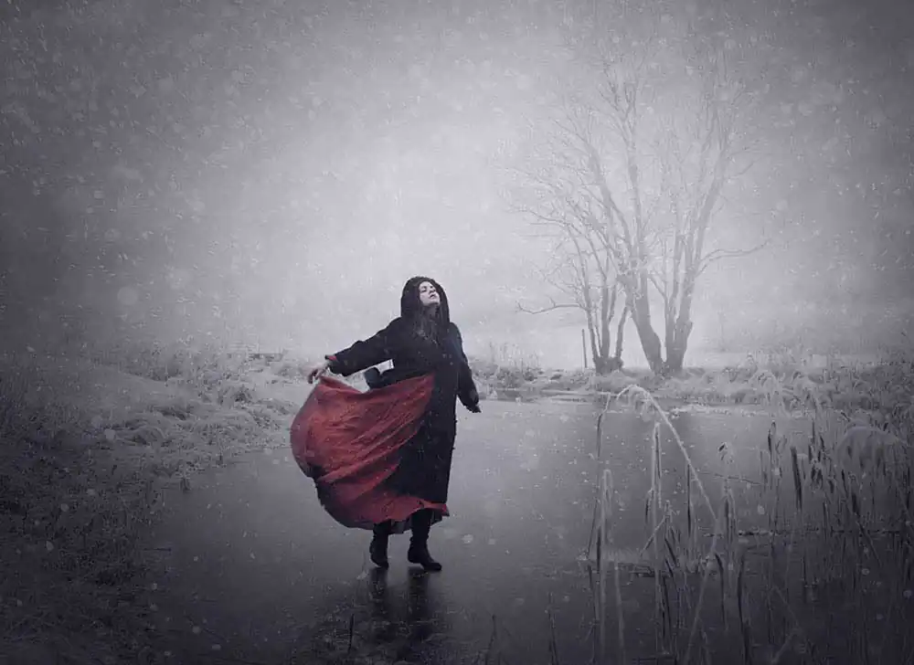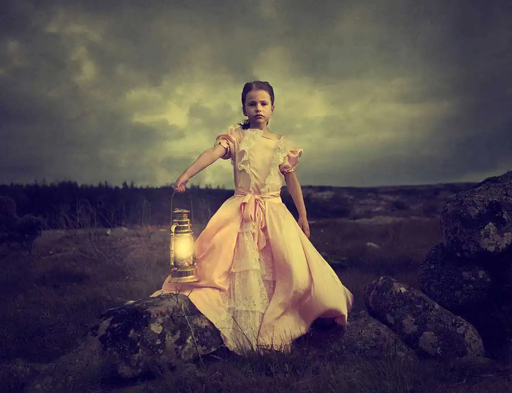 The color red is a common thread that binds several of the images together. It represents her bloodline, flesh and roots that interacts with the bleak nordic landscape. The lanterns in the images guides the subjects through the dark landscape. The subjects immerse themselves in their surroundings, becoming one with nature. Maren included an image of her daughter in the series in order to show how the Scandinavian nature affects different generations. Her own childhood was deeply affected by the darkness during the winter and often triggered her depression. The image of Emily talks about Maren’s fear for her daughter. Will she inherit her mother’s sensitivity to the dark months?