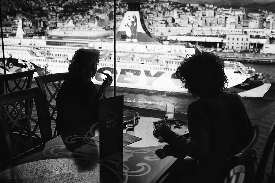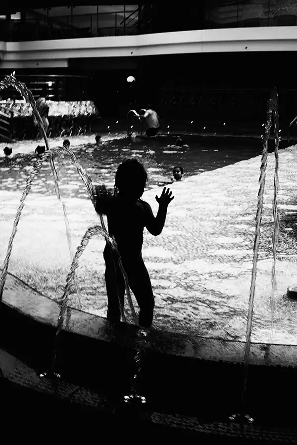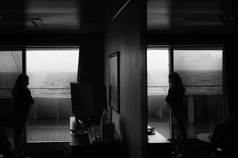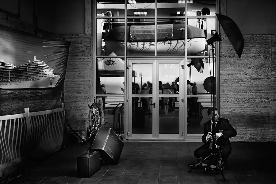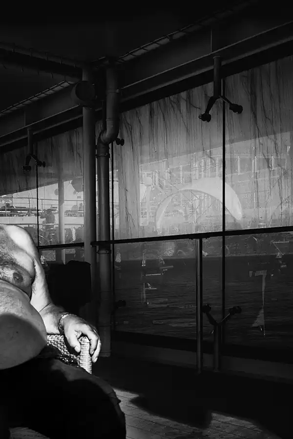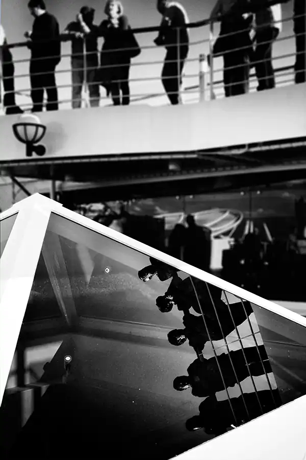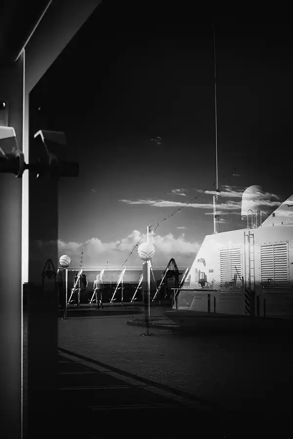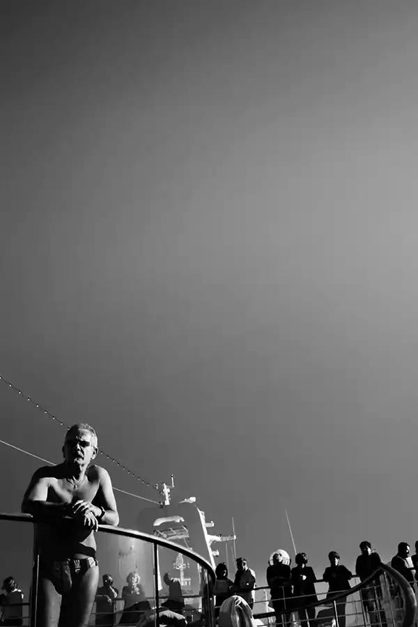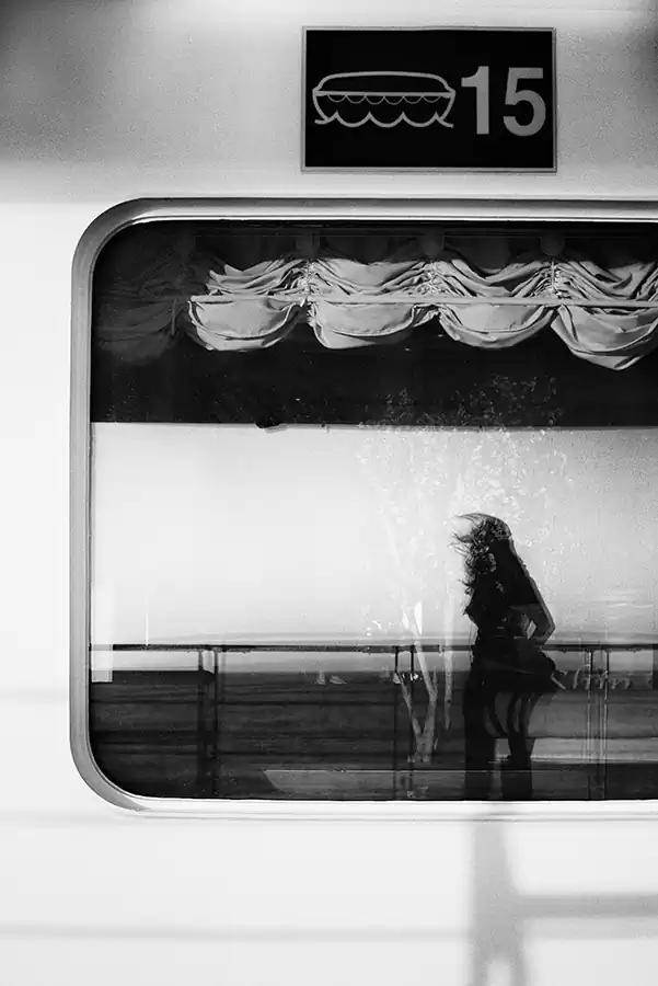 My life crosses other people’s lives, who are like me, everyone and anyone. I through the seas in a travel that becomes perpetual motion; that becomes human flow animating a floating city; I become sap that pulsates on the decks, in the corridors, in the sparkling halls, between the jets of water in the swimming pools. I’m a multitude with no history and no identity. Through my shadow projected on the bulkheads, through my profile drawn in the light, through my silhouette repeated in a endless mirror game, I tell you my story, which is the story of a thousand, an hundred thousand people. I become one body in the apparent chaos of a cruise ship, big beast to which, although for a short time, I belong. A maternal womb, a home in which every man is an island.”