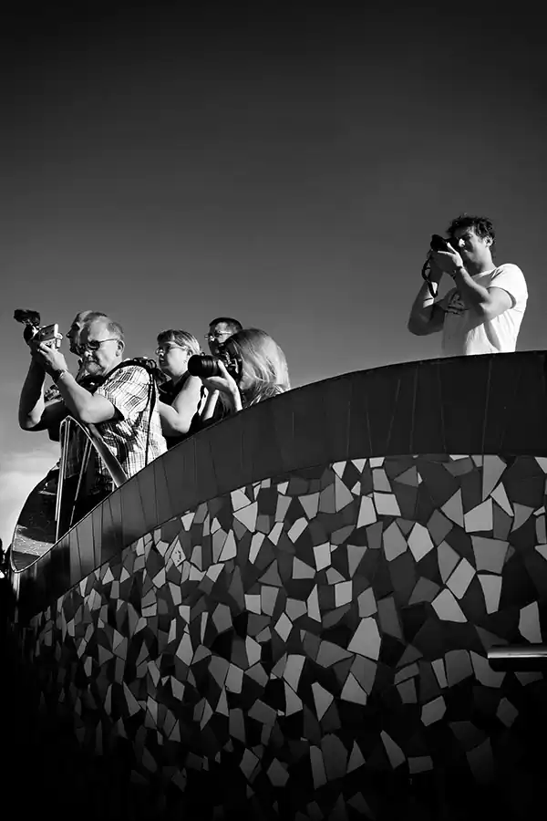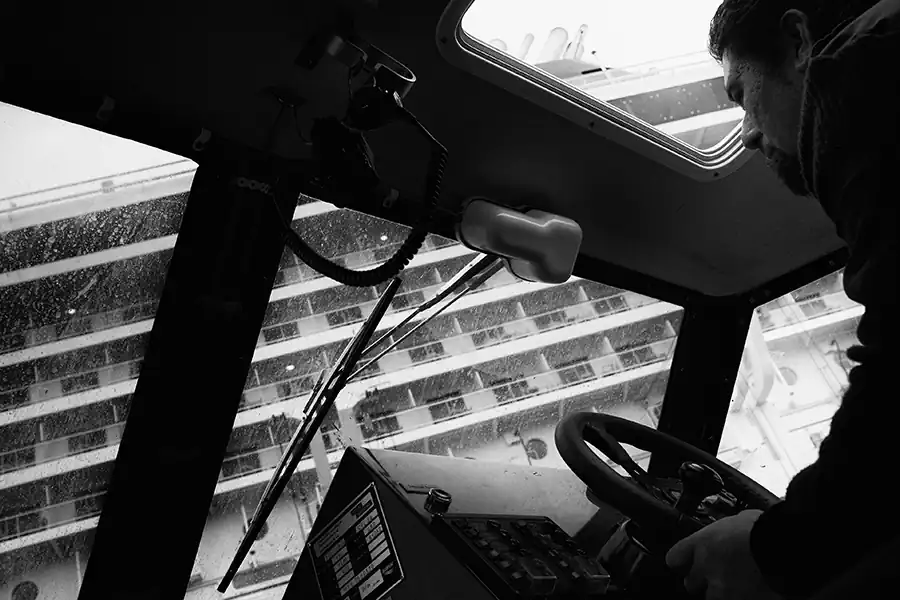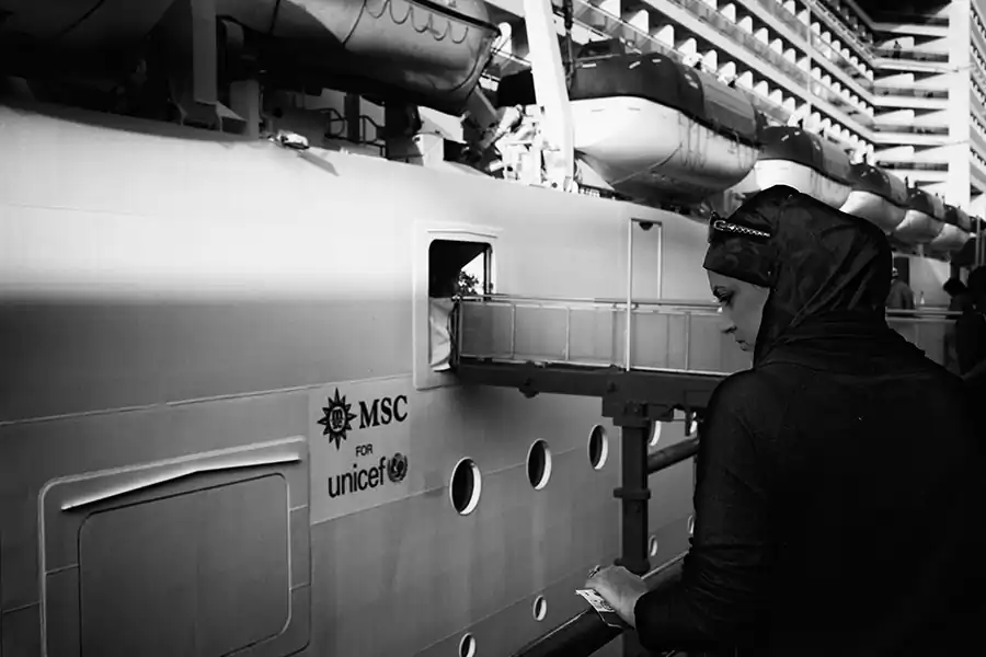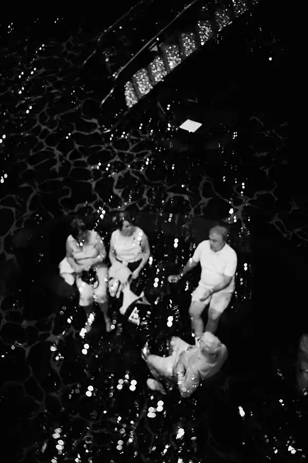 Like spying through a keyhole, I project myself into the lives of the passengers and crew of a big cruise ship. Through my camera I observe this multitude of people, always the same and always different, giving rise to a huge and cosmopolite isolated society on the seas. Every year in Europe, cruise ships carrying more than 100,000 passengers. This is fascinating: the cruise ship, a bright and sparkling city in the sea, is the smallest container with the largest concentration of people from all over the world. People always different, divided into “social” categories, following strict rules, living in a tiny space. So, whoever you are, whatever your life or your history is, here, on the sea, you lose your identity to become part of a huge mechanism that runs cyclically, which is renewed in a continuous motion. You become one body, everyone and anyone, deprived of any connection with reality and with your being. [Official website]