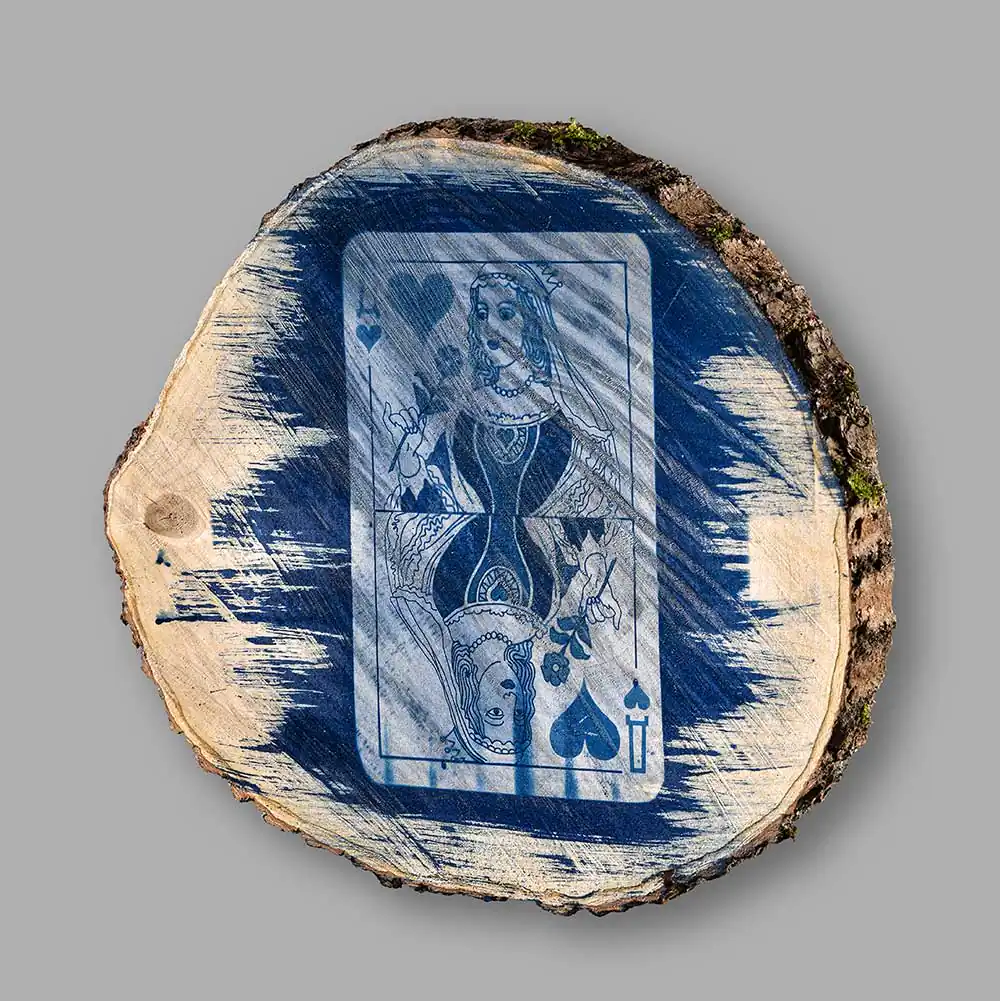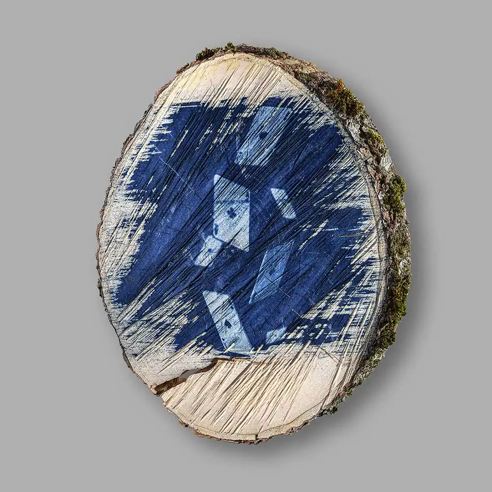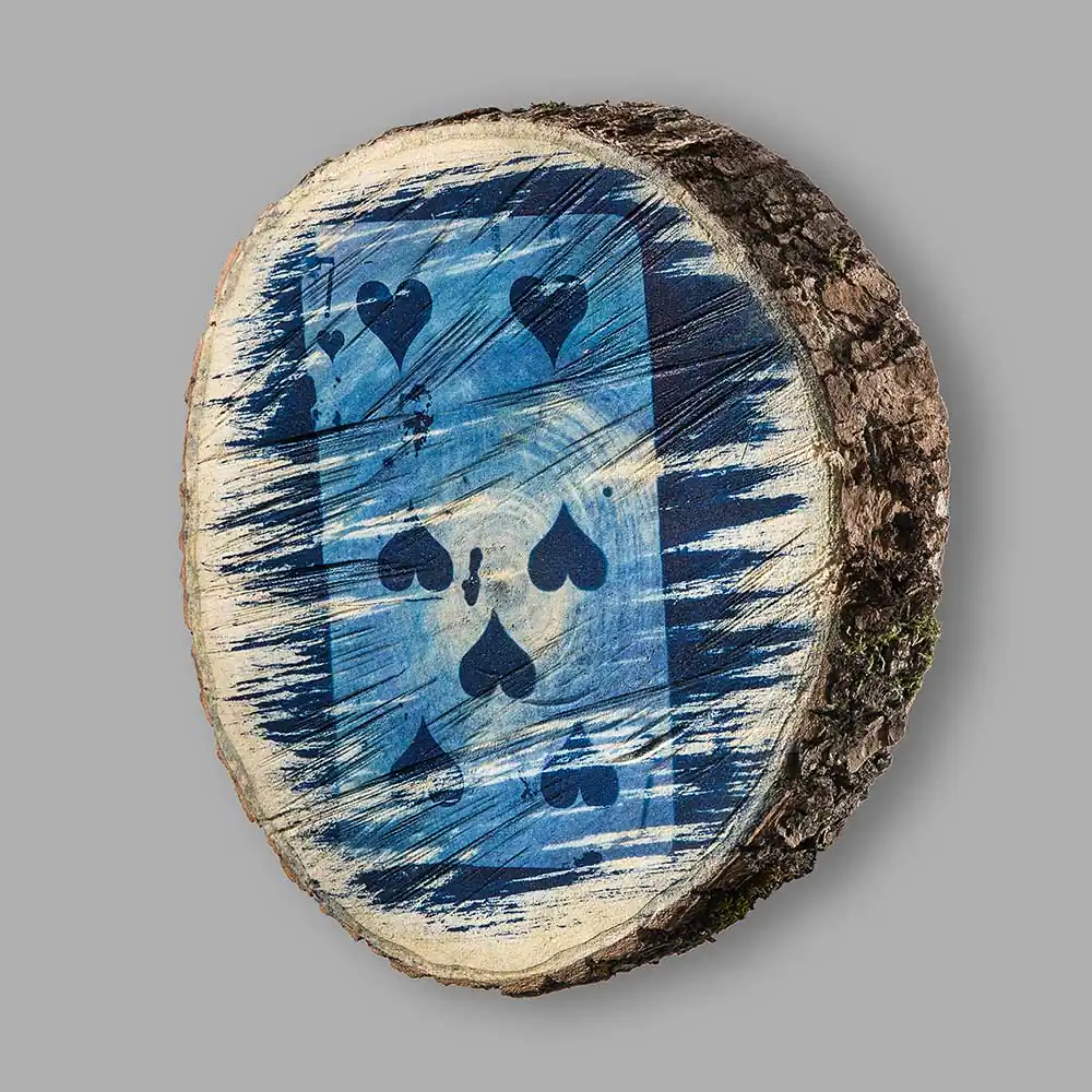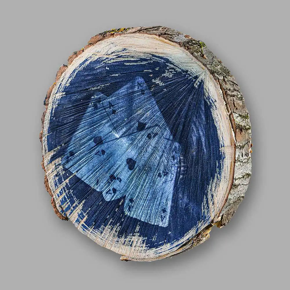 This year’s experimental art cycle Invisible Games (from Cyanotype series) was especially surprising for me. Exploring the methods of application of the cyanotype technique the artist selected horizontal cut-outs of a tree trunk as the surface of his images, printing down the pictures of playing cards on the wooden facet. Some are more visible, others are faded and seem to be printed fragmentarily, accidentally. The forceful visual effect is achieved through harmoniously applied means: ash maple wood, food gelatine, chemical additions necessary for cyanotype technical solutions, solarium, water, negative and sunlight.