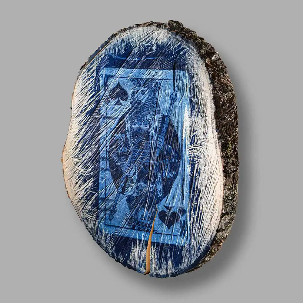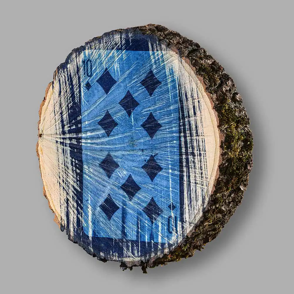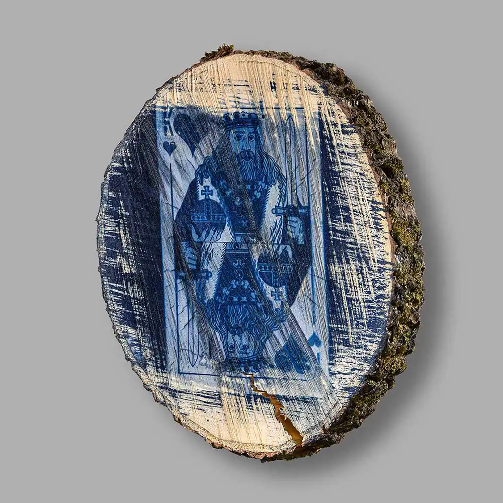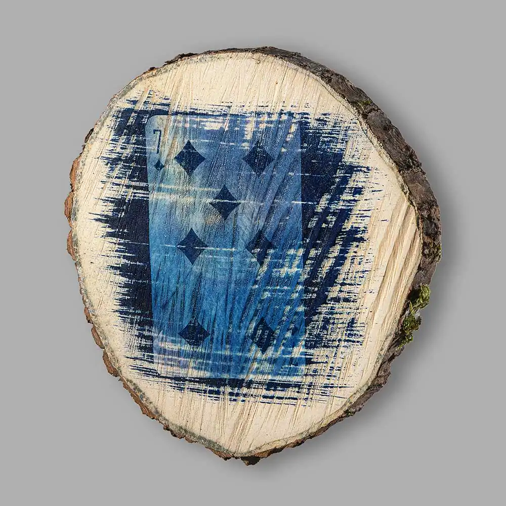 This year’s experimental art cycle Invisible Games (from Cyanotype series) was especially surprising for me. Exploring the methods of application of the cyanotype technique the artist selected horizontal cut-outs of a tree trunk as the surface of his images, printing down the pictures of playing cards on the wooden facet. Some are more visible, others are faded and seem to be printed fragmentarily, accidentally. The forceful visual effect is achieved through harmoniously applied means: ash maple wood, food gelatine, chemical additions necessary for cyanotype technical solutions, solarium, water, negative and sunlight.