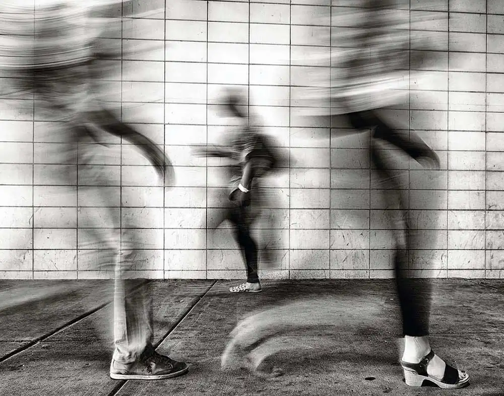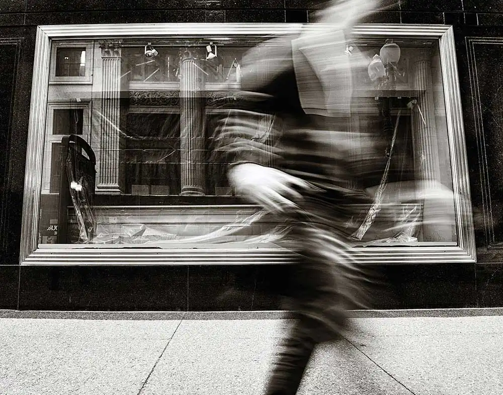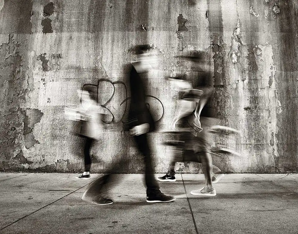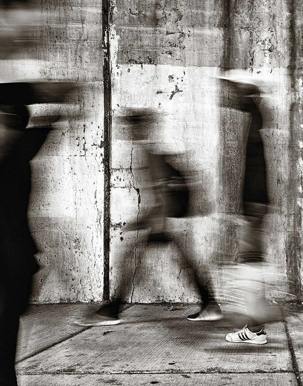 Street photography can be fascinating. I think it’s because we are naturally nosy. We want to stare, to absorb the details and imagine the facts. In real time, on the street, we only get a glimpse of passing strangers. We don’t have permission to stare. The great thing about a street photograph is that we have permission to stare. The subjects in one-sixth of a second are motion blurred. Motion blurring removes some of the detail we seek. It’s as if we have permission to stare, but only at what we might have perceived in a quick glance.Some of the images in the series are single exposures. In the others I have created a time-collage by combining two or more images from a single tripod-mounted sequence.